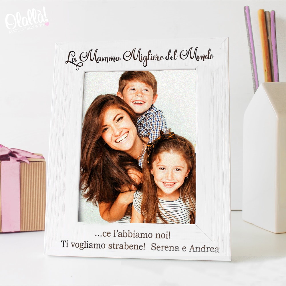 Splendida cornice in legno “La Mamma Migliore del Mondo” personalizzata con incisione dedicata alla Festa della Mamma. Personalizza la cornice con le dediche che preferisci! Puoi scegliere la frase in alto e quella sotto alla foto.