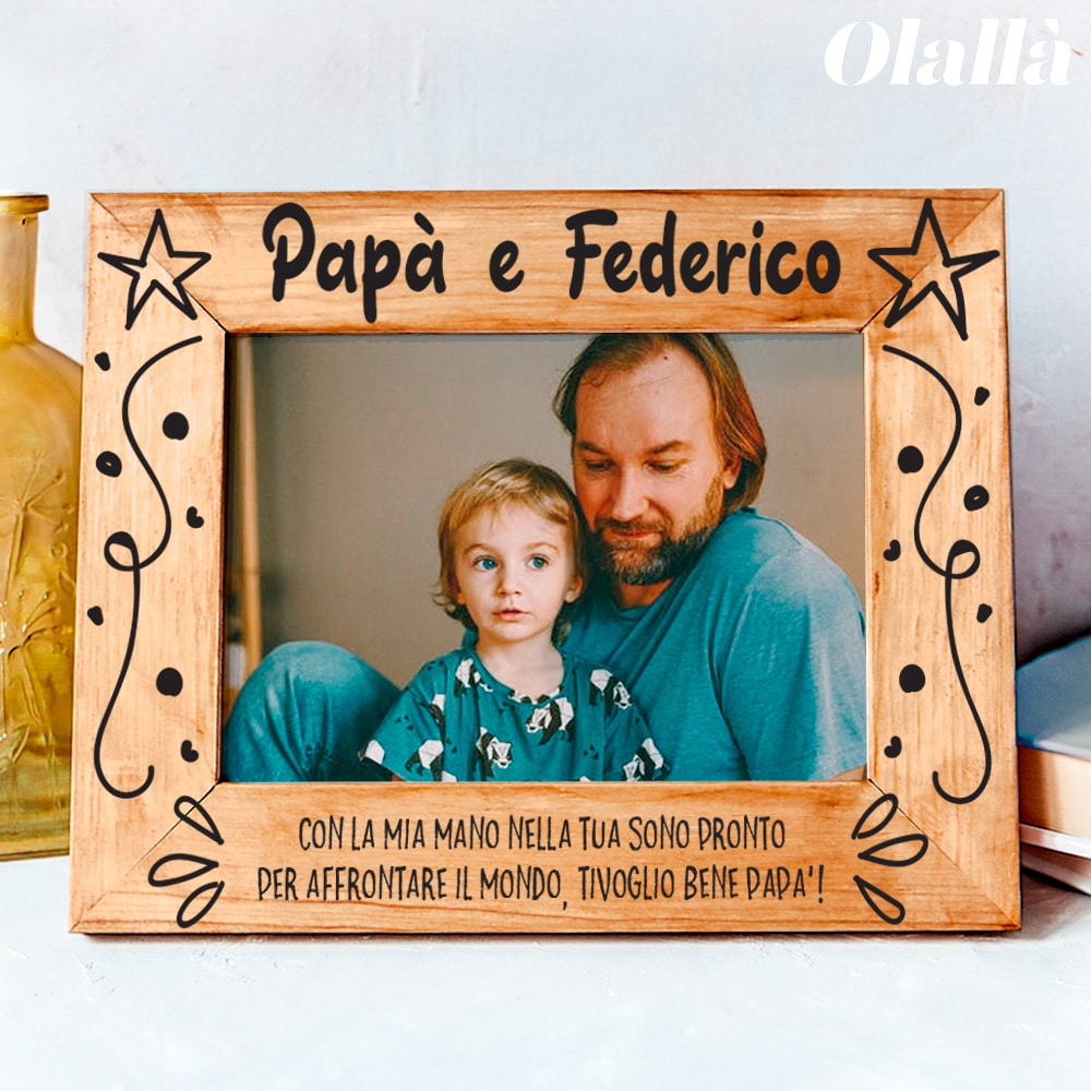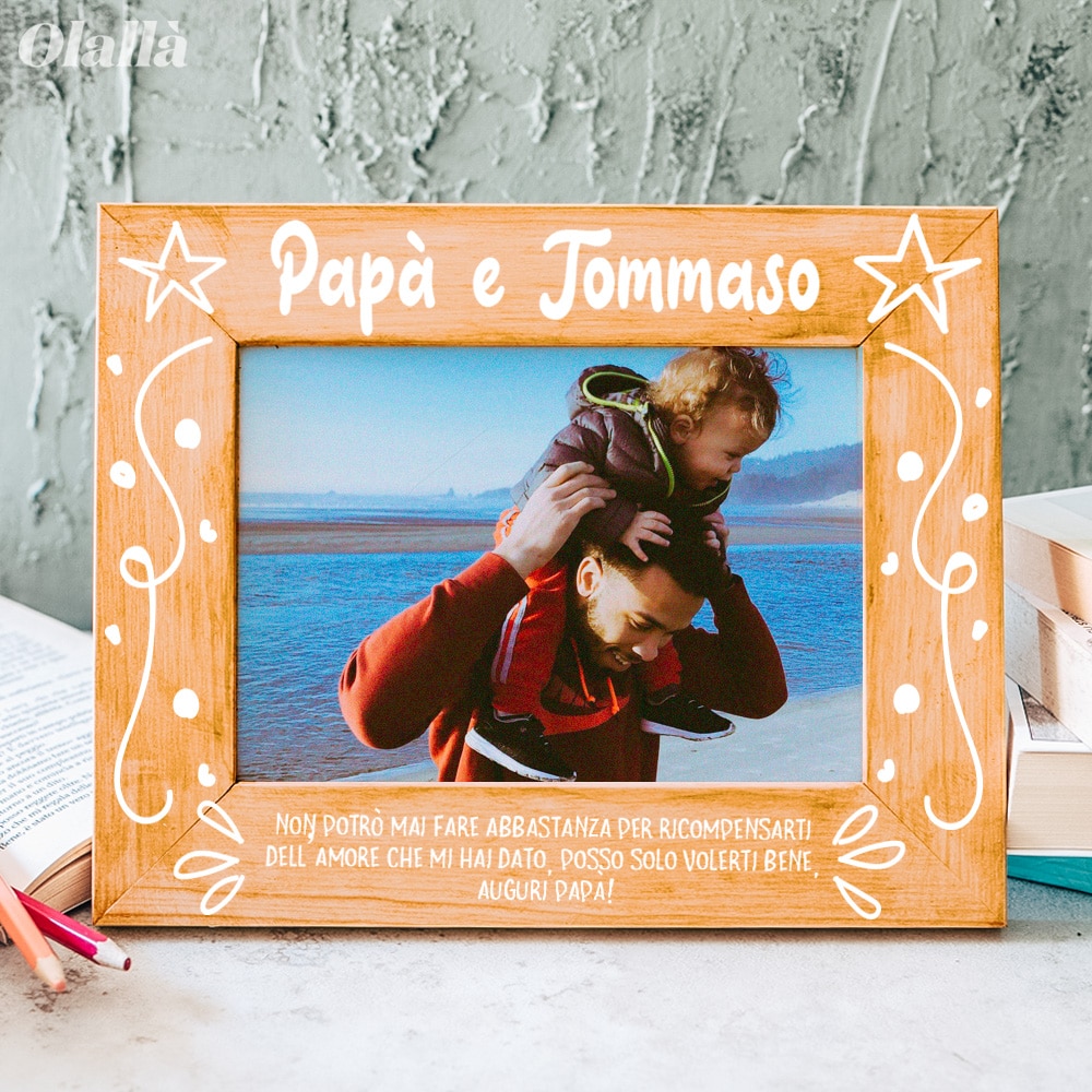 Bellissima cornice in legno personalizzata con una dolce dedica e un decoro di festoni. Emoziona il tuo papà con un regalo autentico e originale da tenere sempre vicino a sé!