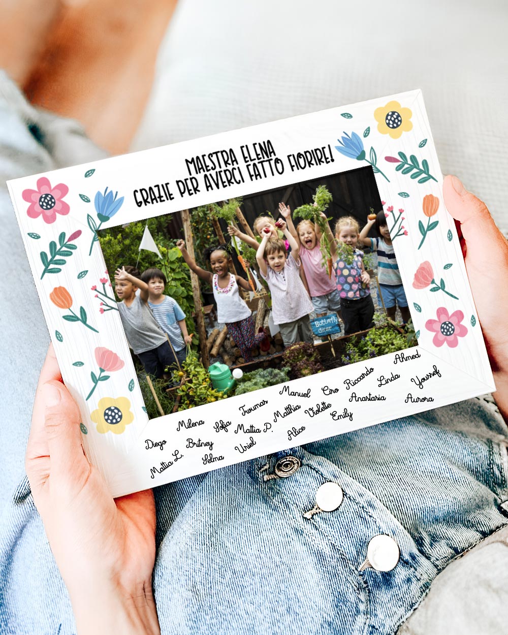 - Facilità di Personalizzazione: Con il nostro sistema intuitivo, personalizzare la cornice è semplice e veloce. Puoi scegliere tra diversi stili di carattere per la dedica e aggiungere i nomi degli alunni senza alcuna difficoltà, creando un regalo davvero unico e significativo.
