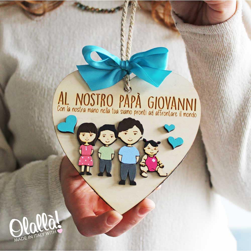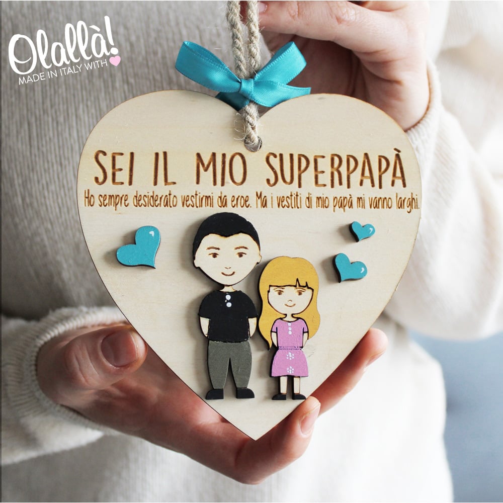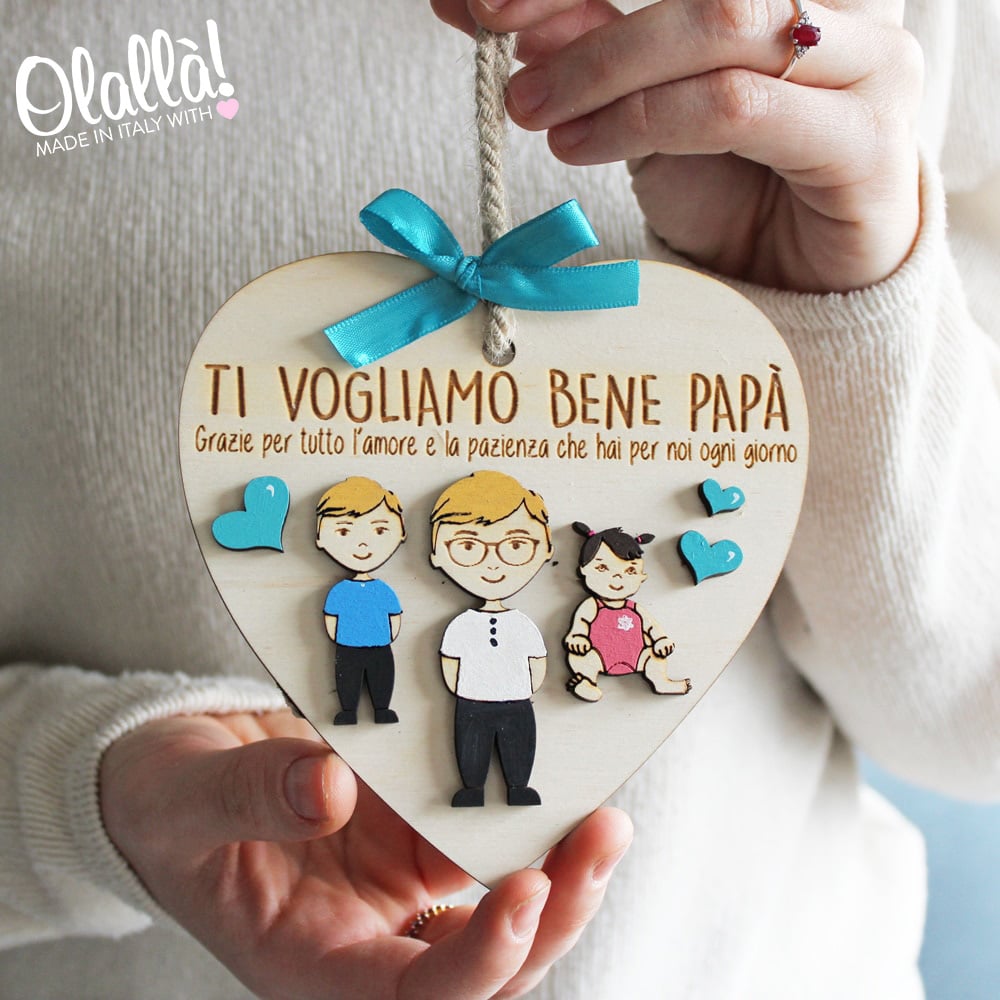 Dolcissima targhetta in legno personalizzata con il ritratto del papà e i suoi piccolini, uno splendido ed emozionante regalino per la Festa del Papà. Può essere appesa grazie al nastro blu di cui è dotata.