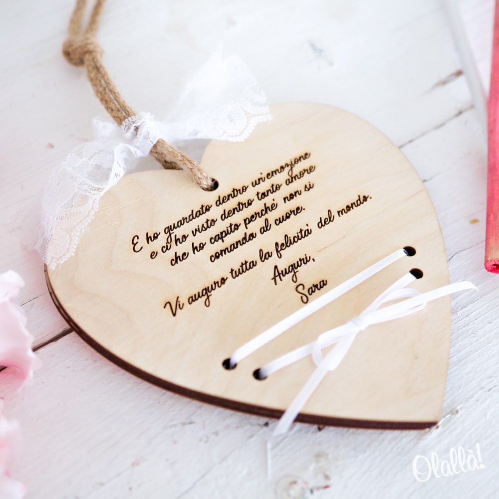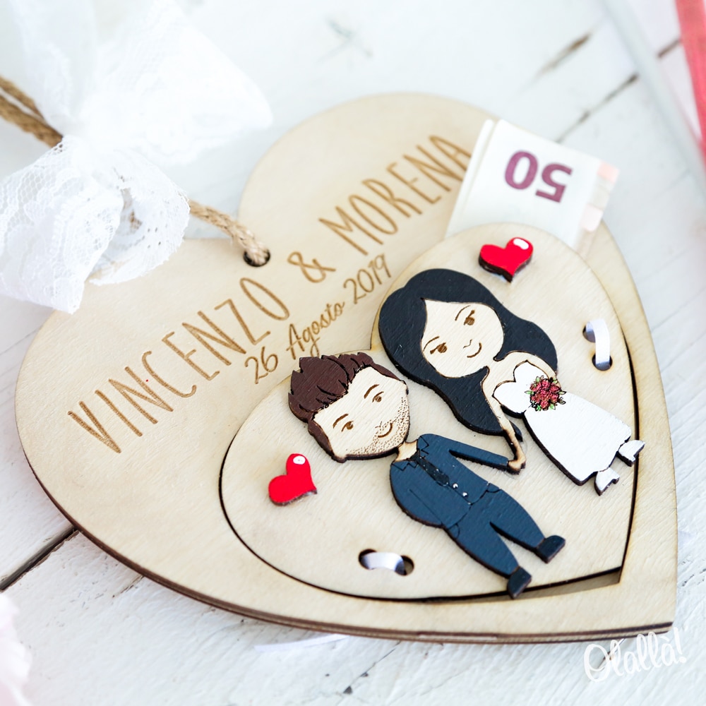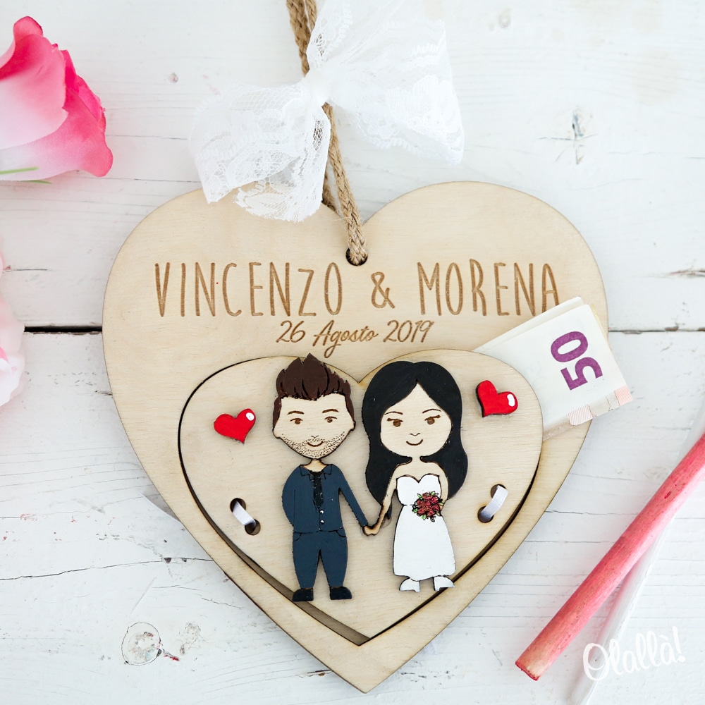 Meravigliosa targhetta portasoldi in legno da personalizzare con il ritratto “mini-me” degli sposi. Un regalo matrimonio superlativo e unico che ti farà distinguere! Può essere appesa grazie al nastro in corda con fiocco bianco di pizzo di cui è dotata.