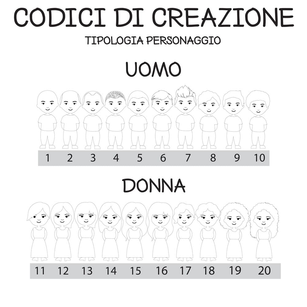 Qualora voleste ulteriori personalizzazioni queste devono essere richieste nell’apposito campo, il quale richiede un piccolo extra per il lavoro di personalizzazione che deve essere realizzato. Per extra si intende per esempio “con indosso una macchina fotografica” oppure “capelli con meches” o ancora “con vestito a righe” o “in costume da bagno a due pezzi di colore rosso”.