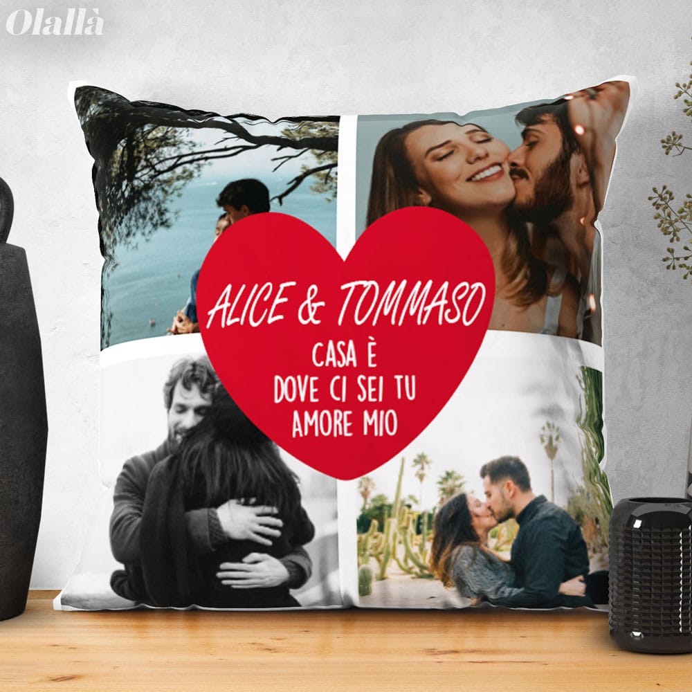 Cuscino con un passionale cuore rosso personalizzato con le vostre foto preferite e la tua dedica d’amore. Il regalo perfetto per festeggiare il vostro anniversario o per sorprendere la tua dolce metà a San Valentino… con questo splendido cuscino la casa parlerà di voi.