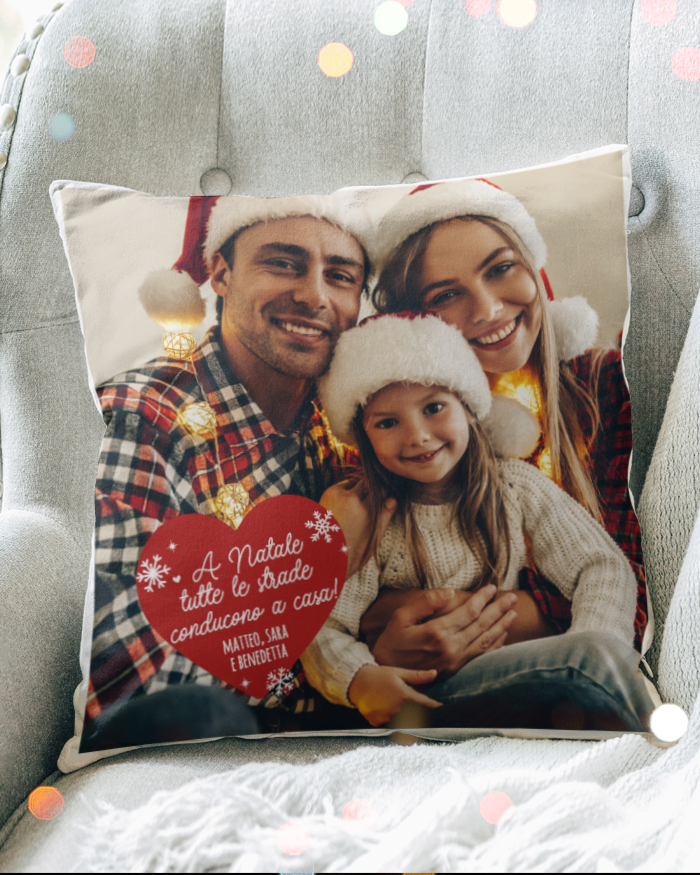Bellissimo cuscino natalizio personalizzabile con foto, cuore rosso e dedica. La tua casa si riempirà di una romantica atmosfera natalizia! E’ il dono perfetto per il tuo partner e come accessorio per decorare il tuo sofà durante le feste.