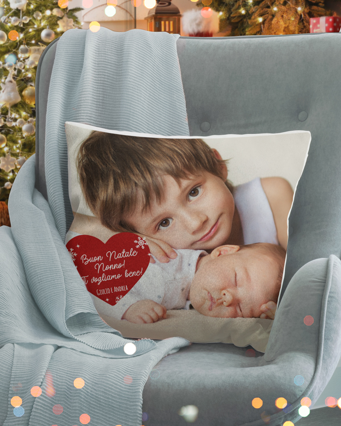 Adorabile cuscino natalizio personalizzabile con foto, cuore rosso e dedica. Rendi magico il Natale regalando a chi ami questo cuscino speciale che renderà la tua casa romantica e decisamente natalizia!
