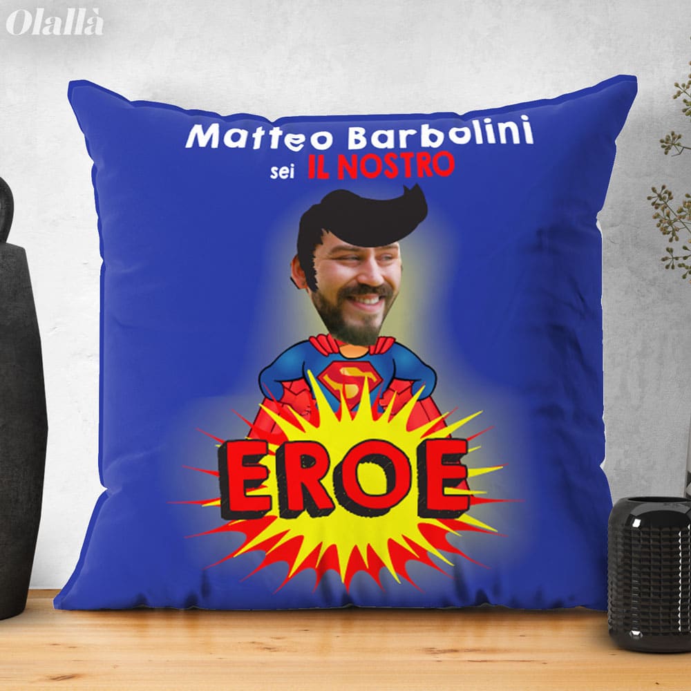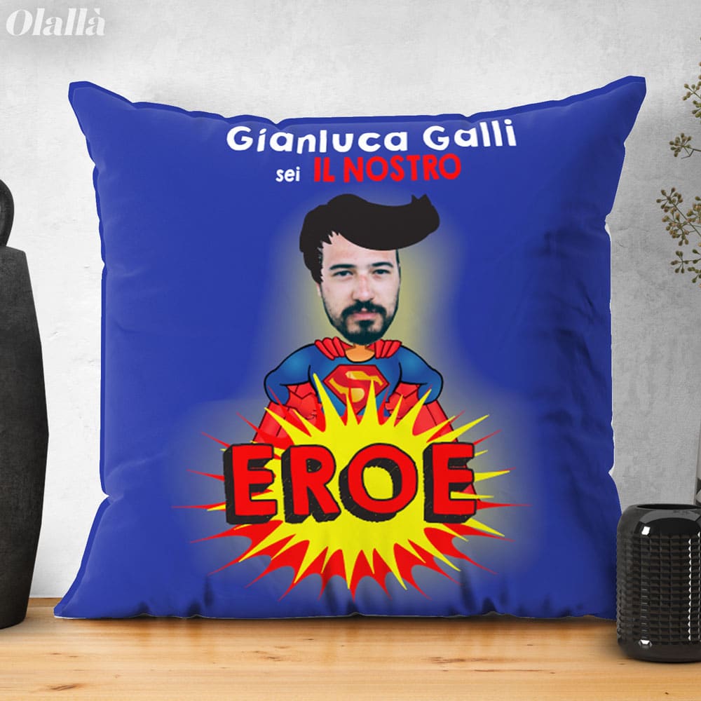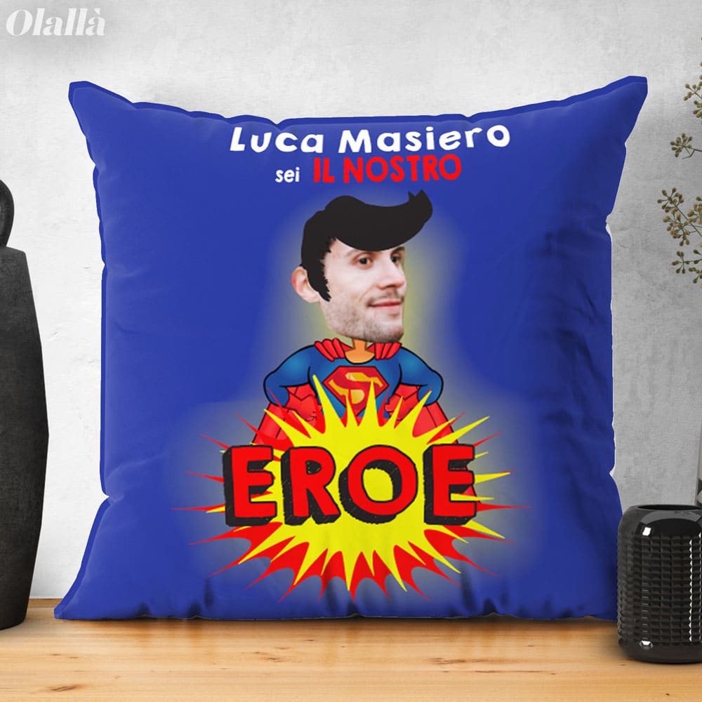 Simpatico cuscino personalizzabile con la caricatura del tuo Papà in veste di Superman. Ti basterà caricare una buona foto del volto del tuo Papà per dare vita a questo divertente cuscino. Personalizza con una dedica sul retro dove spieghi perché è solo lui il tuo super eroe e fai un regalo originale che lo saprà sicuramente divertire!