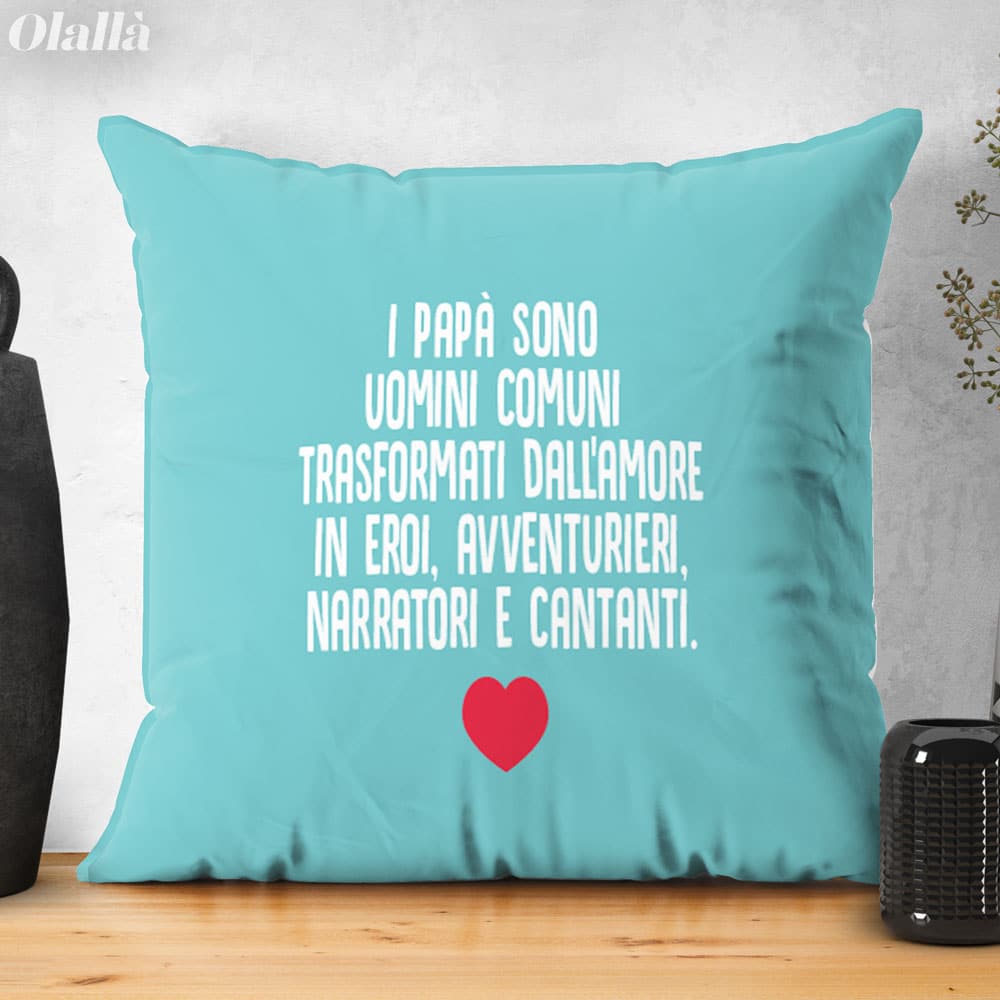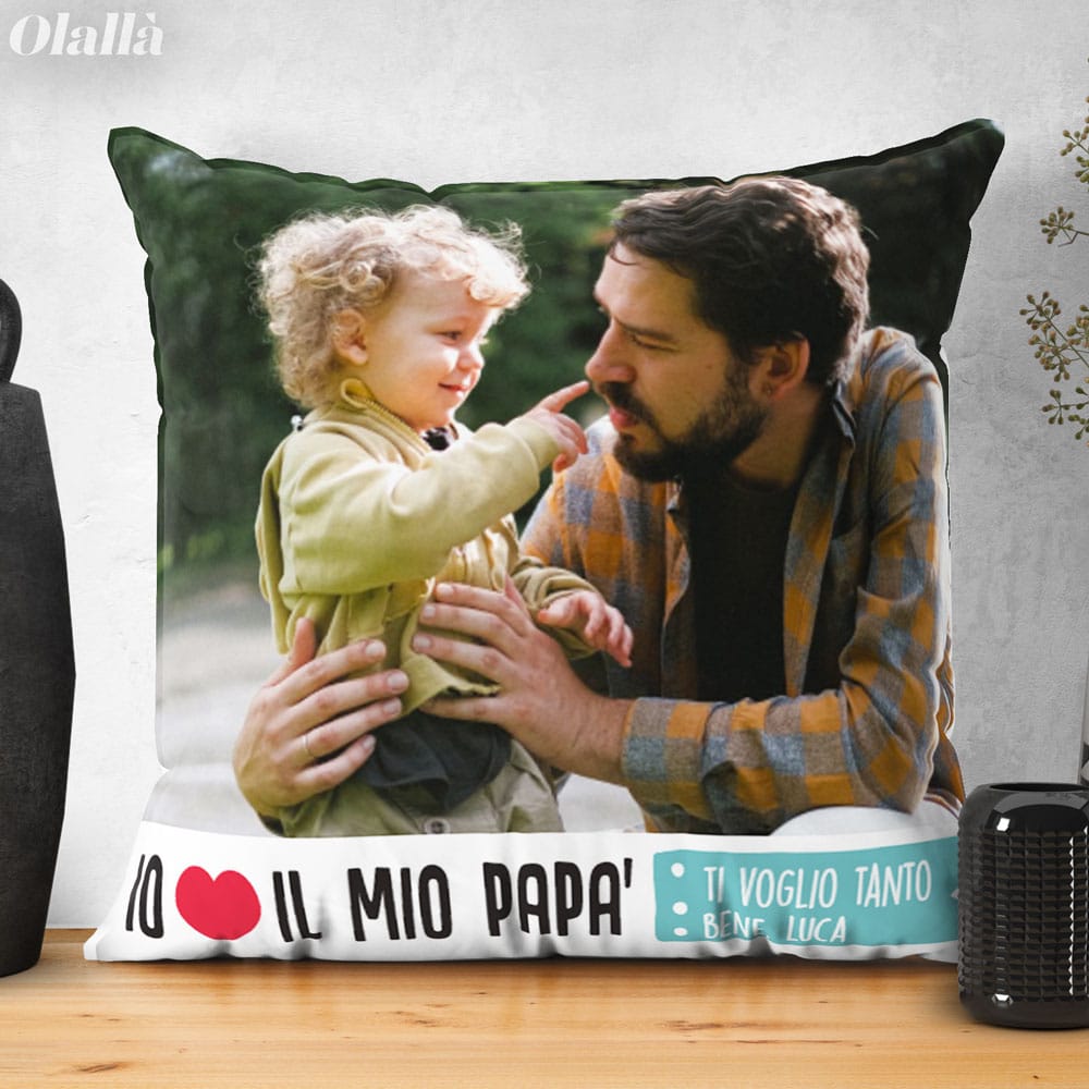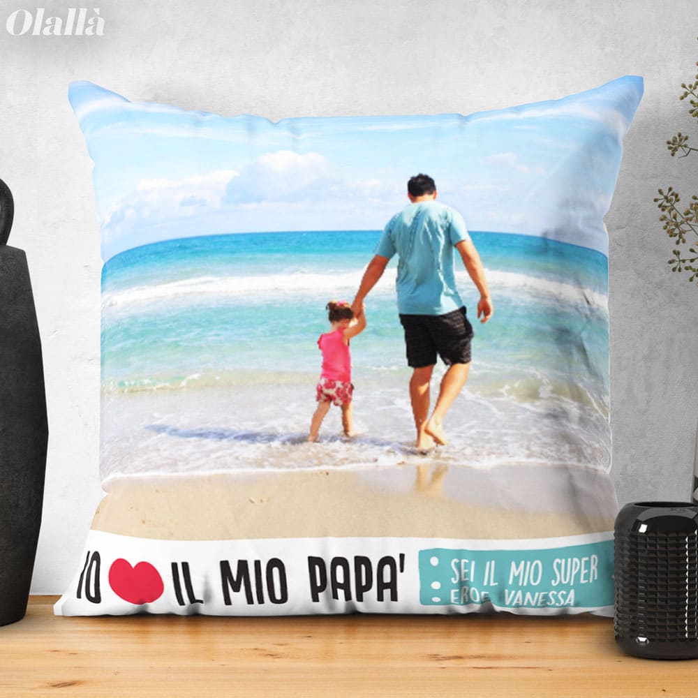 Splendido cuscino personalizzabile con la foto e la tua dedica. Un regalo bello e super originale che emozionerà il papà nel giorno della sua festa. Altissima qualità di stampa, le foto sembrano prendere vita sui nostri cuscini!