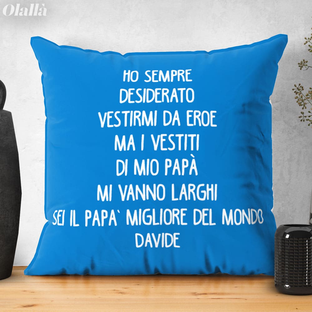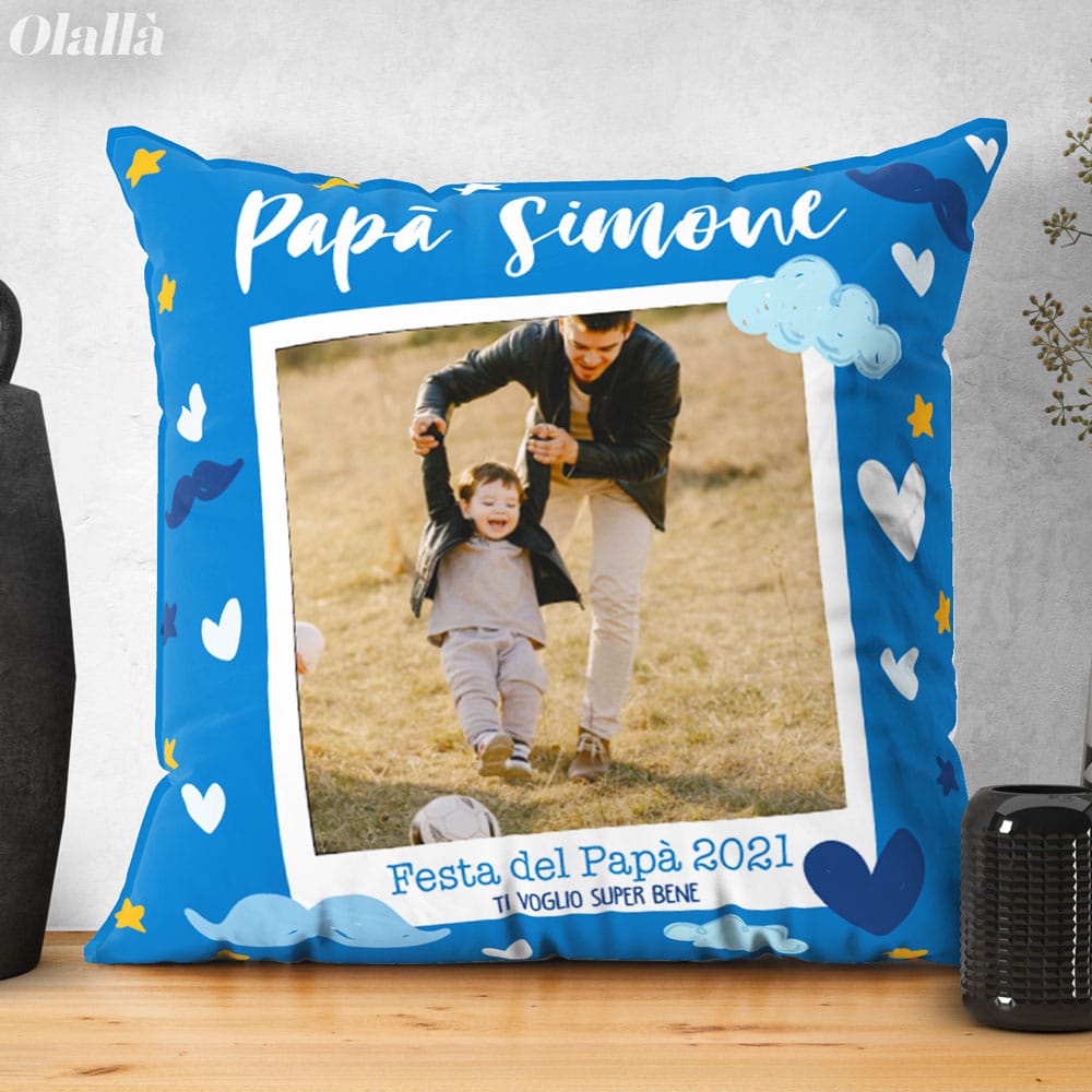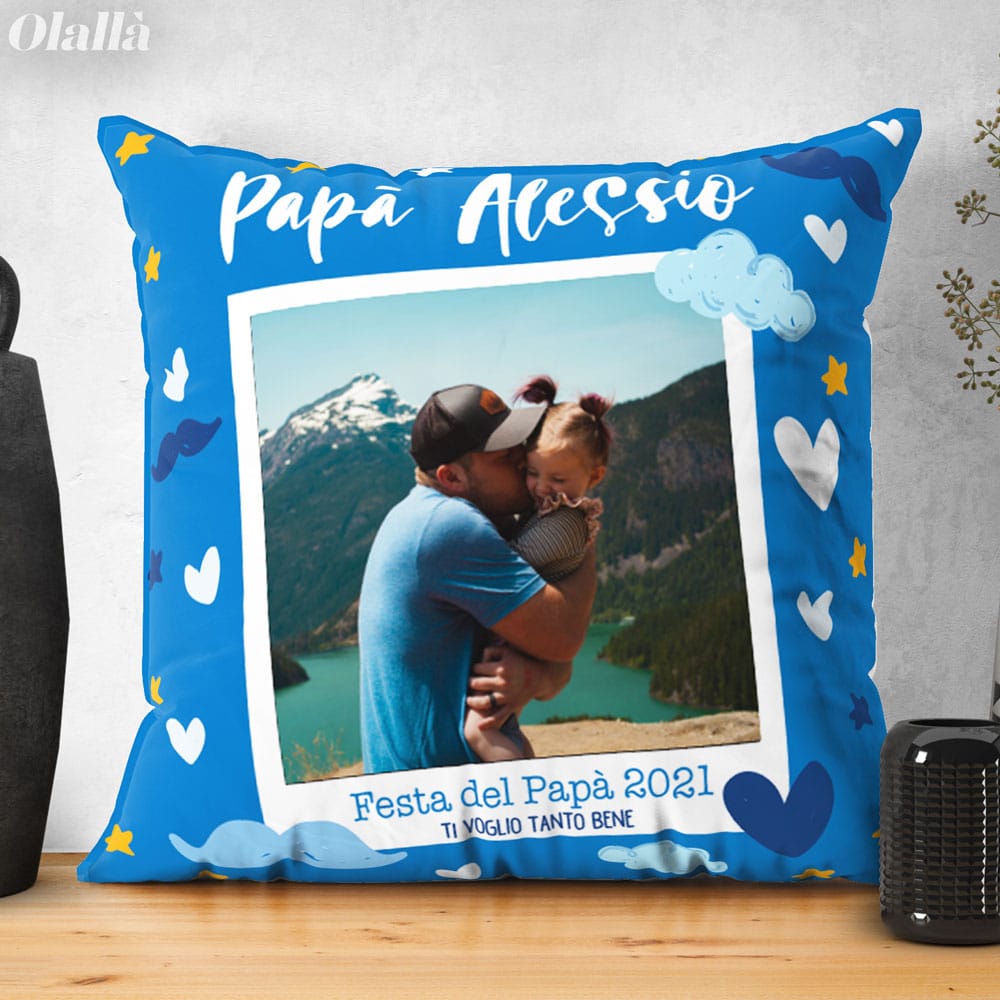 Splendido cuscino personalizzabile con la foto e la tua dedica. Un regalo bello e super originale che emozionerà il papà nel giorno della sua festa. Altissima qualità di stampa, le foto sembrano prendere vita sui nostri cuscini!