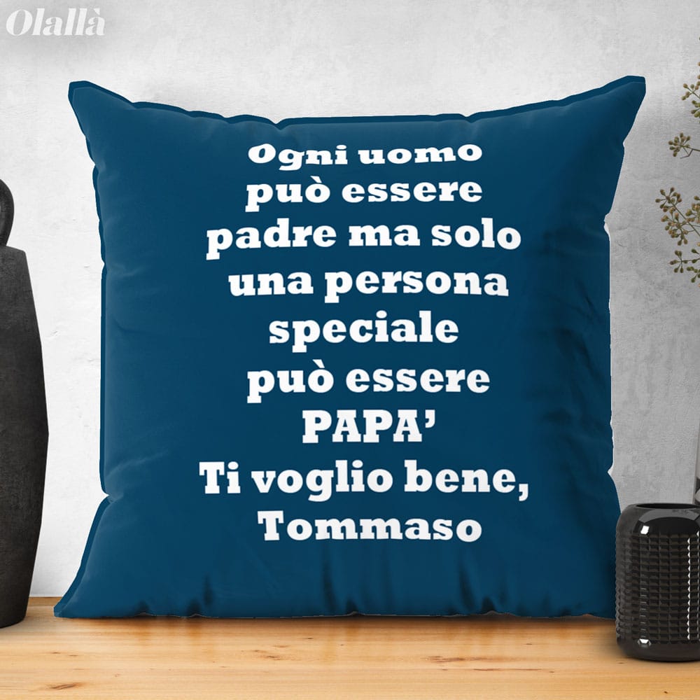 Splendido cuscino personalizzabile per il tuo super papà con il nome, la dedica e un’ulteriore frase sul retro. Un regalo bello e super originale che il 19 Marco lo emozionerà nel giorno della sua festa. Ideale anche per il suo compleanno o per qualsiasi speciale occasione.