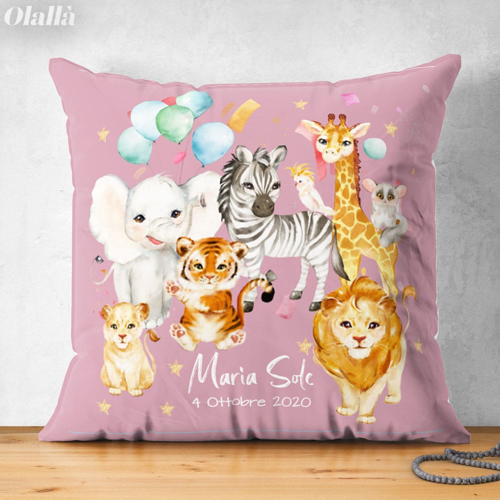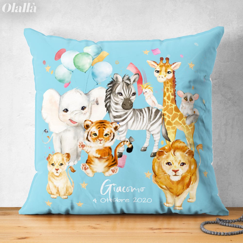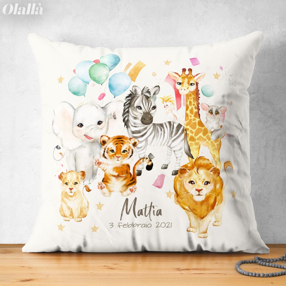 Dolcissimo cuscino personalizzato a tema savana con dolcissimi animali in festa per la nascita o il compleanno del tuo bambino. Aggiungi il nome del bambino e la data della sua nascita per fare un regalo originale e morbidissimo. Finiscilo con una dedica personalizzata sul retro, per rendere il tuo regalo davvero per sempre. 3 bellissimi colori per lo sfondo tra cui scegliere.