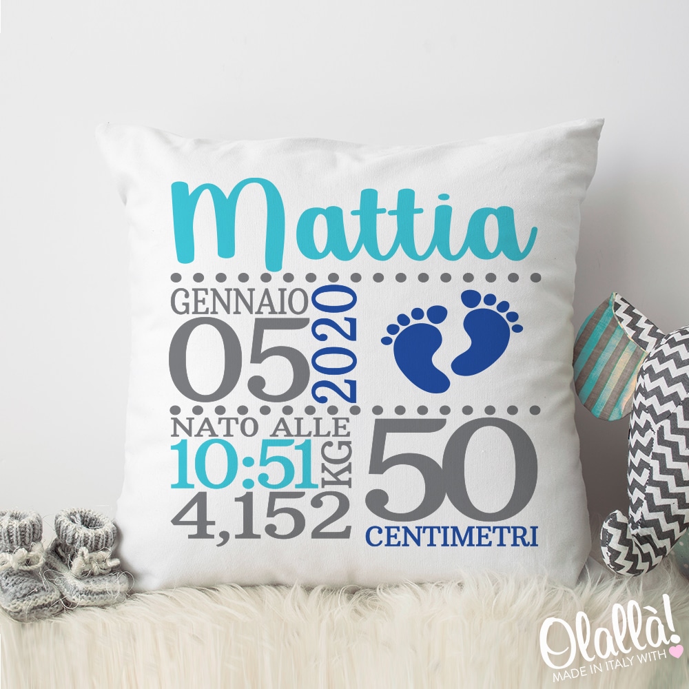 Dolcissimo cuscino personalizzato con tutti i dati di nascita del nuovo arrivato in famiglia. Una fantastica idea regalo per un’amica che ha dato alla luce una nuova vita, per celebrare l’evento in modo unico e originale.