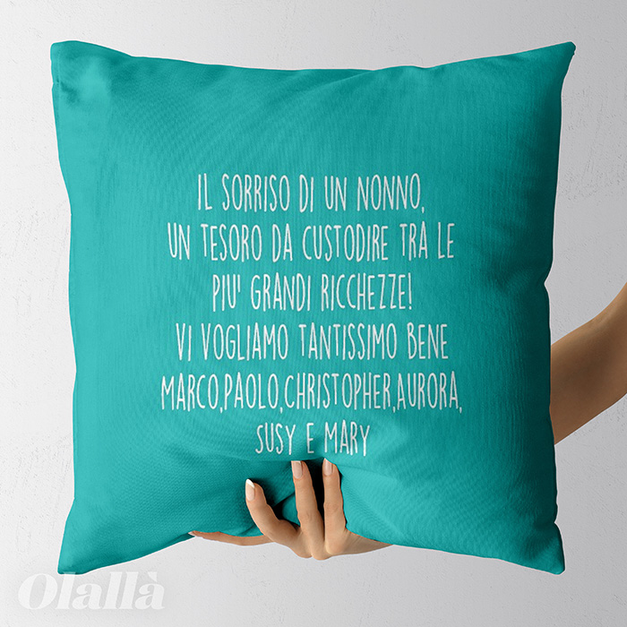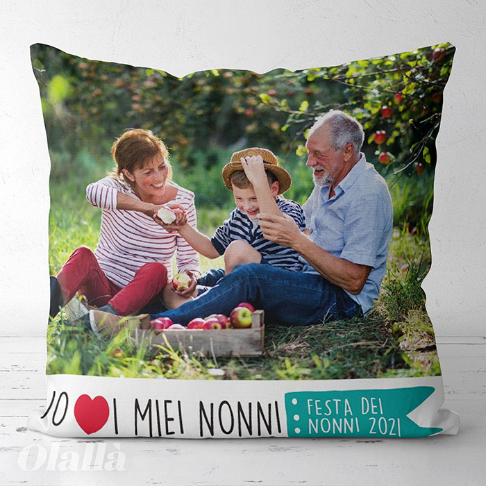 Cuscino con la tua foto e dedica con cuore pensata per i nonni. Aggiungi la foto che ritrae il tuo bimbo assieme ai suoi nonni, personalizza la tua dedica, completa con la frase che desideri sia stampata sul retro e realizza il tuo regalo speciale e super originale!