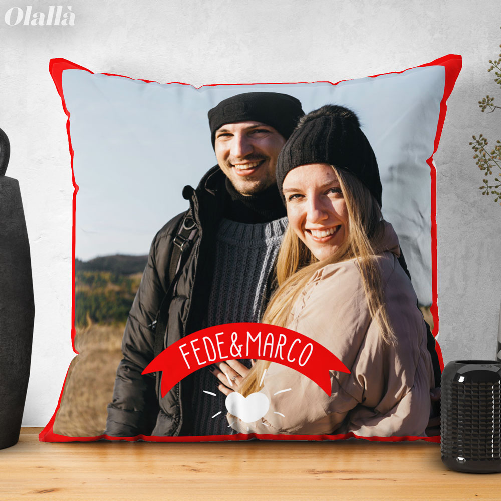 Bellissimo cuscino con la vostra foto del cuore e nomi. Il regalo perfetto per tenere sempre con voi un pezzo della vostra storia d’amore, tutto da stringere e perfetto per far parlare la vostra casa di voi! Ideale per l’anniversario, rendilo ancora più tuo aggiungendo le tue parole sul retro.