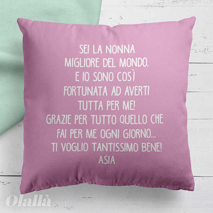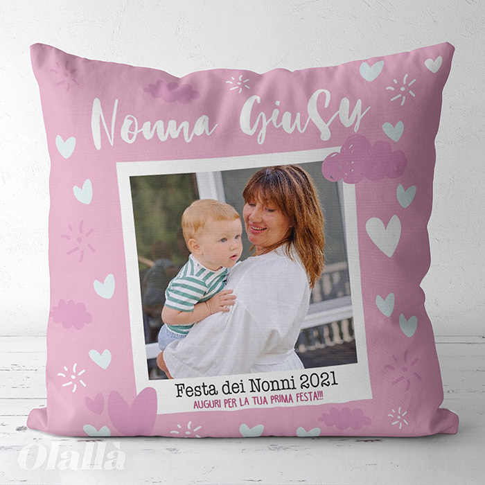 Splendido cuscino dedicato alla Nonna del tuo cuore. Aggiungi la foto che ritrae il tuo bimbo assieme alla sua nonna sulla polaroid, personalizza il nome e la tua dedica speciale, completa con la frase che desideri sul retro e realizza il tuo regalo speciale!