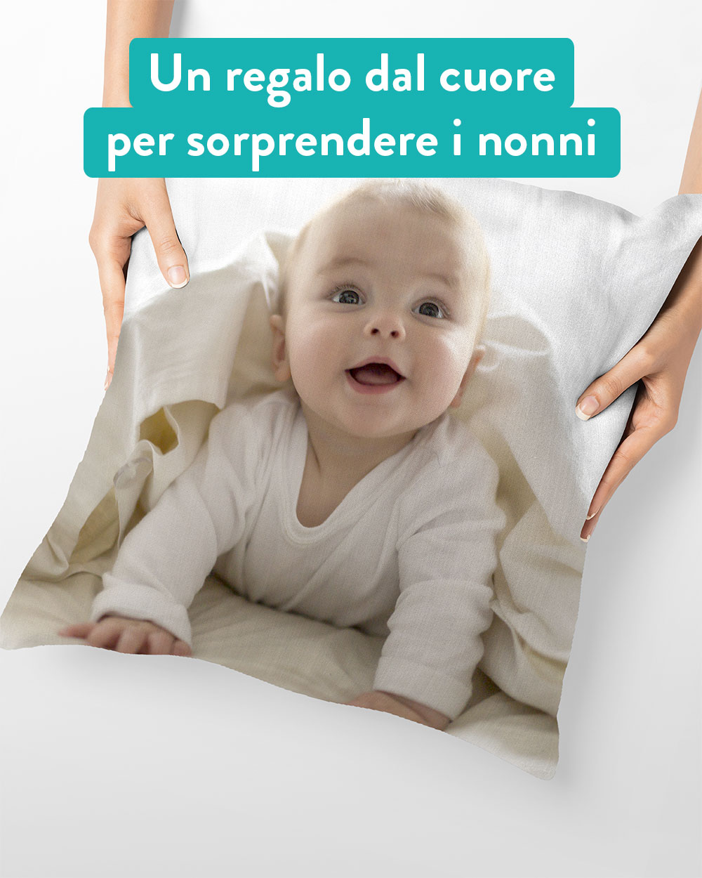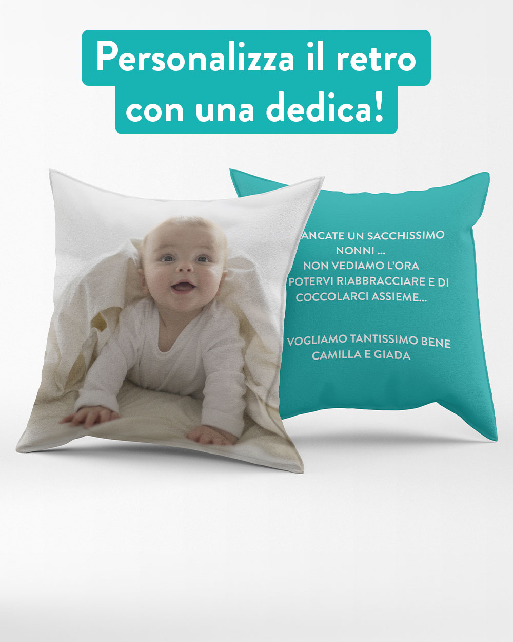 Cuscino stampabile su tutta la superficie con la tua foto del cuore e una dedica sul retro. Fai felici nonni e nonne, mamme e papà con un cuscino tutto da stringere per sentirsi un po’ meno lontani nonostante le distanze.