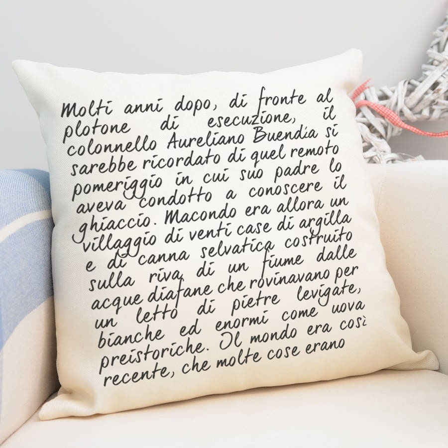 Bellissimo cuscino personalizzato con la frase del vostro libro preferito. Questo cuscino personalizzato è perfetto come idea regalo per l’inizio della convivenza: basterà personalizzarlo con la frase del vostro libro preferito ed il gioco è fatto!