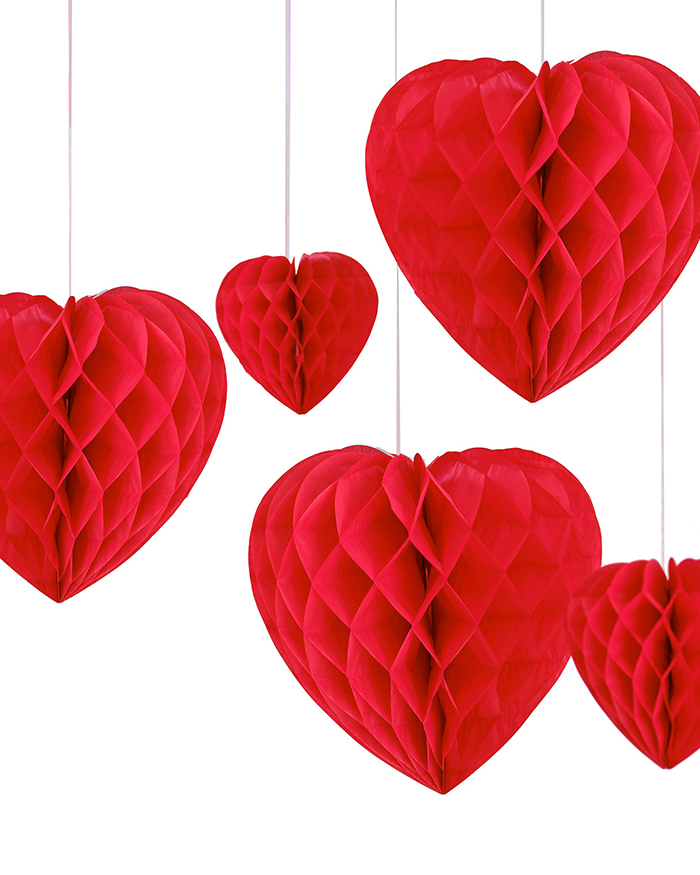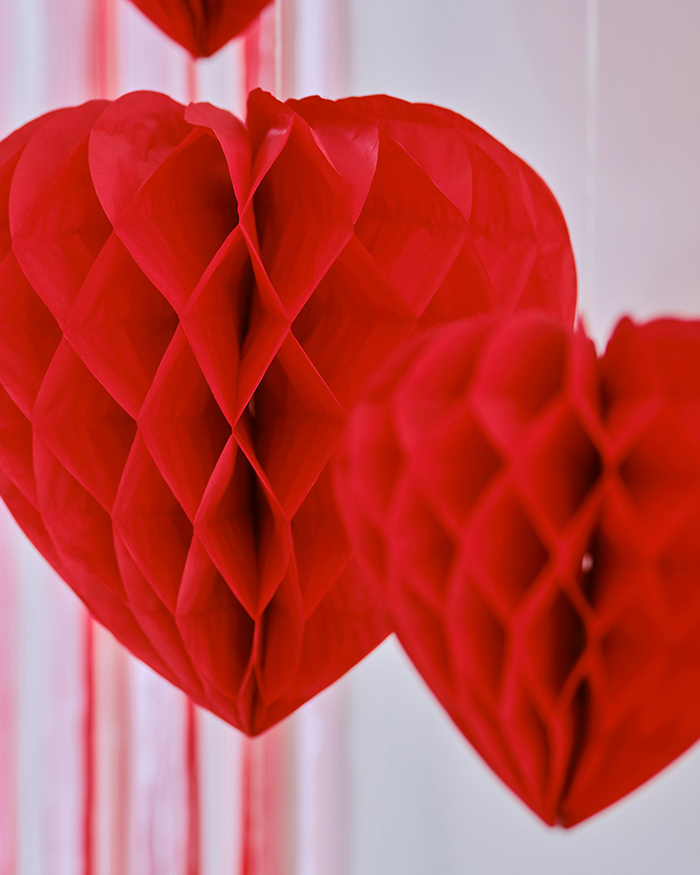 Originalissimo kit con 5 cuori in carta rossa a nido d’ape e tutto il necessario per poterli appendere. Perfetti per creare intriganti scenografie in casa e nella tua camera! Usa questo set per un San Valentino spettacolare, grazie al gioco di ombre creato dalla superficie irregolare.