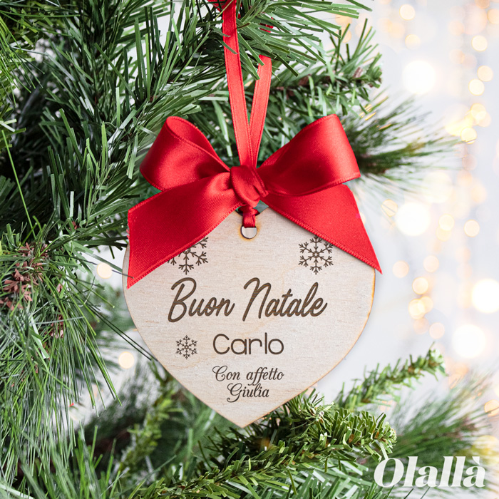 Carinissima decorazione da appendere all’albero di Natale a forma di cuore personalizzata con un decoro inciso di fiocchi di neve ed il vostro messaggio speciale. Fantastico regalino di Natale per amici, familiari e colleghi!
