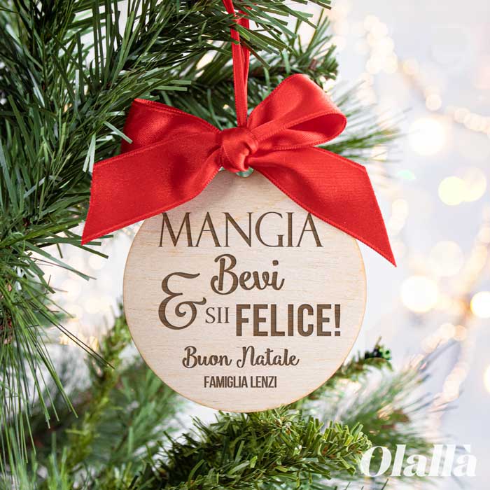 Carinissima decorazione da appendere all’albero di Natale a forma di palla di natale con scritta Mangia, Bevi e Sii Felice!
