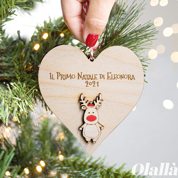 Decorazione personalizzata a forma di alberello o cuore e la simpaticissima renna Rudolph. Il raffinato nastro rosso di raso la rende facile da appendere all’albero di Natale. Personalizzate la frase incisa con una dolce dedica, esempio “Il primo Natale di Giulia”, sarà un regalo che sorprenderà i genitori e colorerà di allegria il loro Natale!