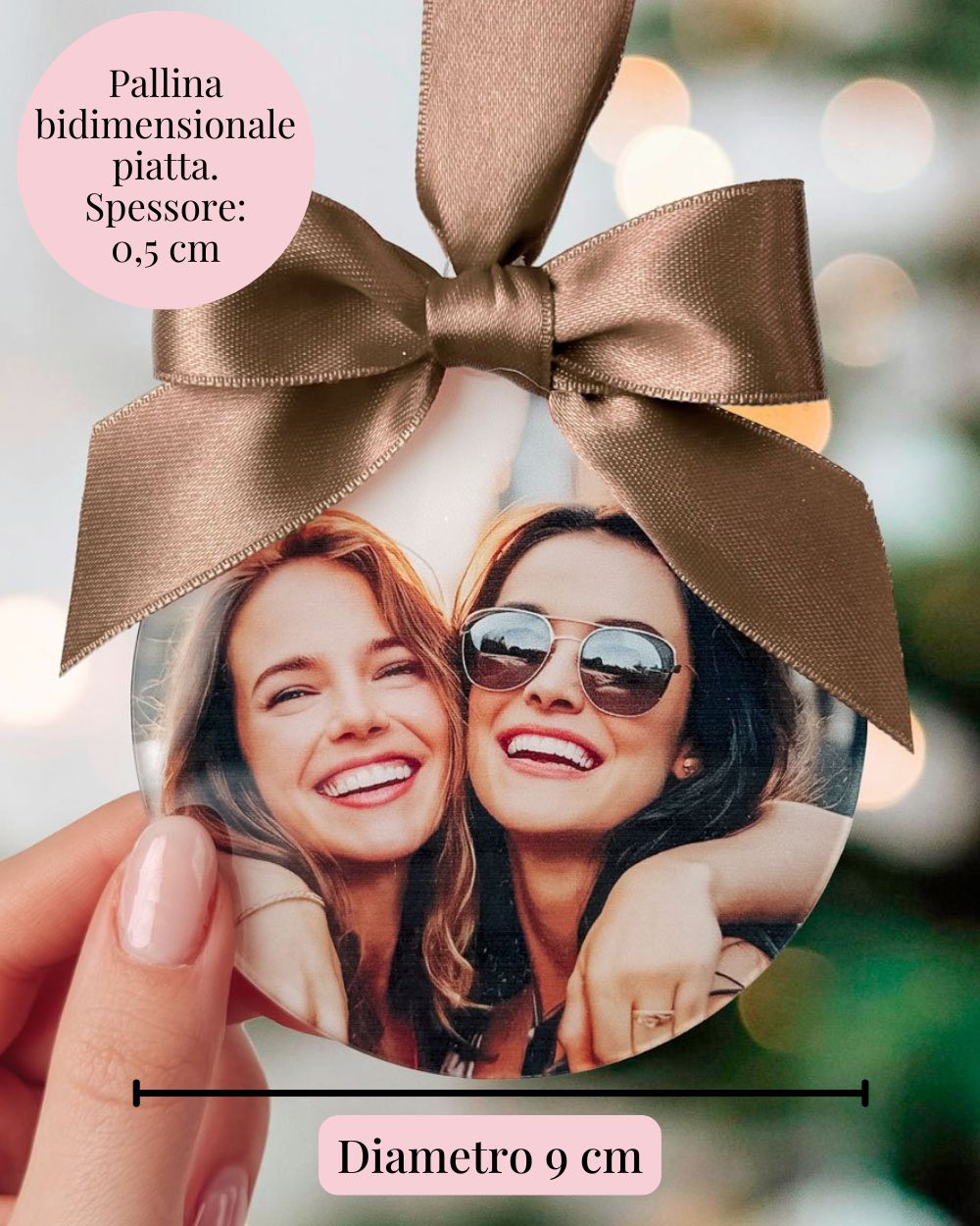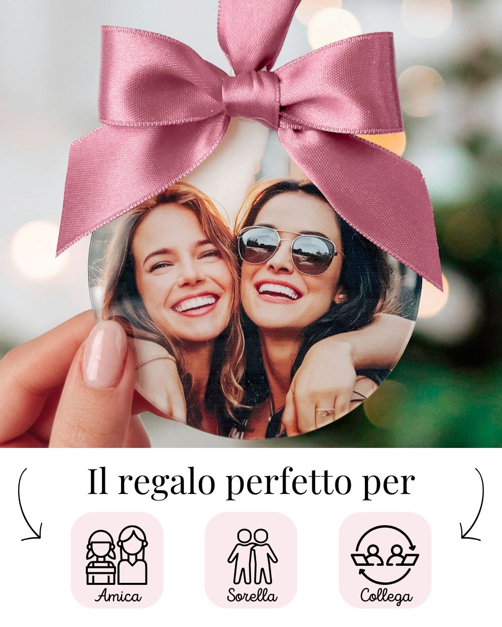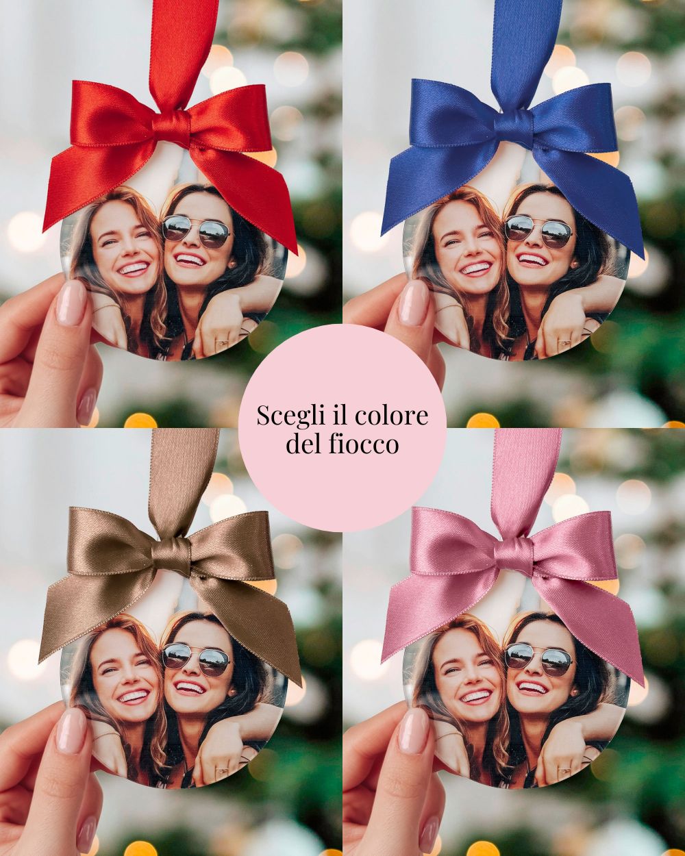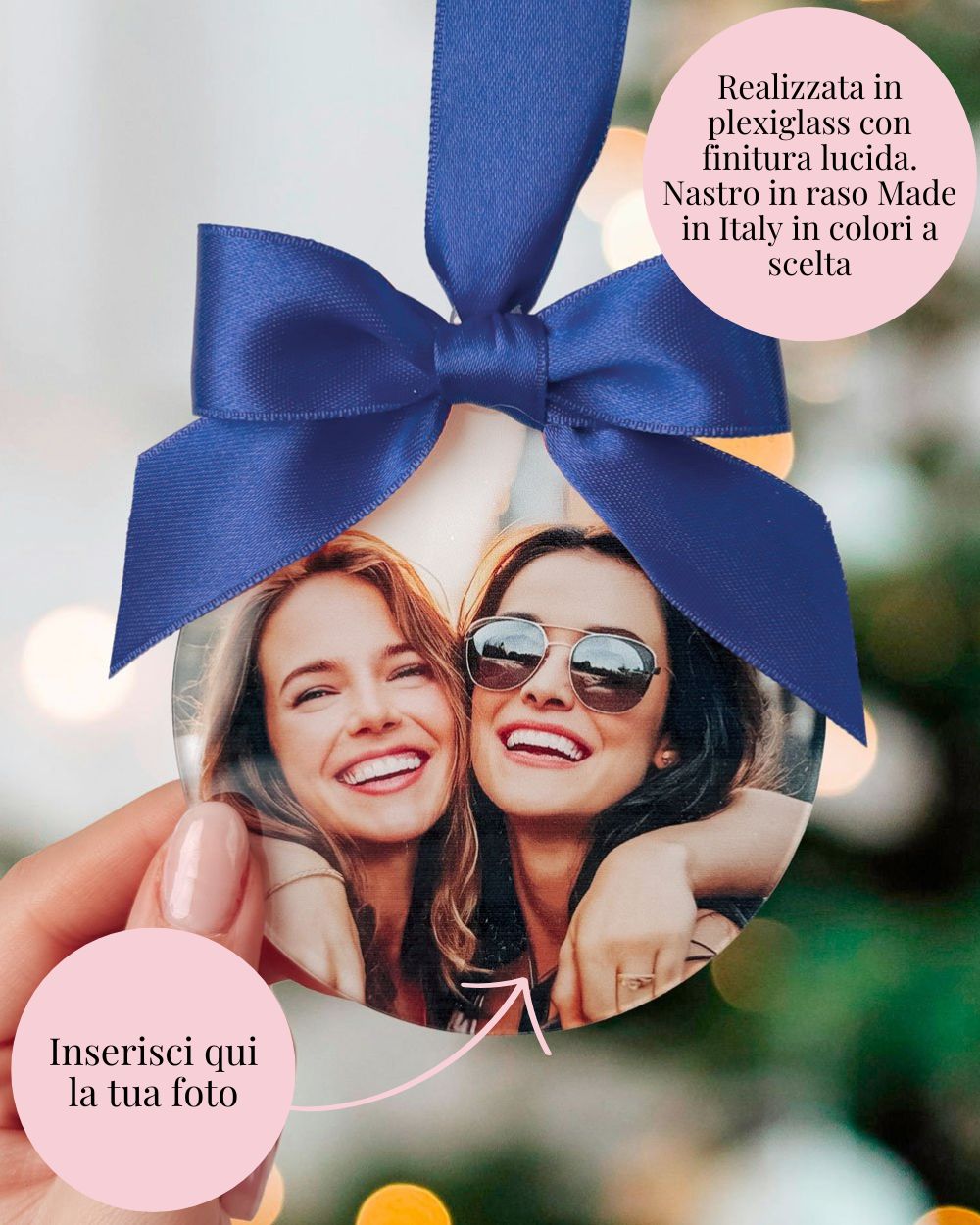 Incredibile Pallina Decorazione per Albero di Natale stampata con la tua foto insieme ai tuoi amici del cuore. Stampata in alta qualità su una pallina dall’effetto lucido e fotografico, è adornata da un fiocco di splendido raso. Questa pallina sarà un perfetto regalo natalizio per tutti i tuoi amici di una vita.