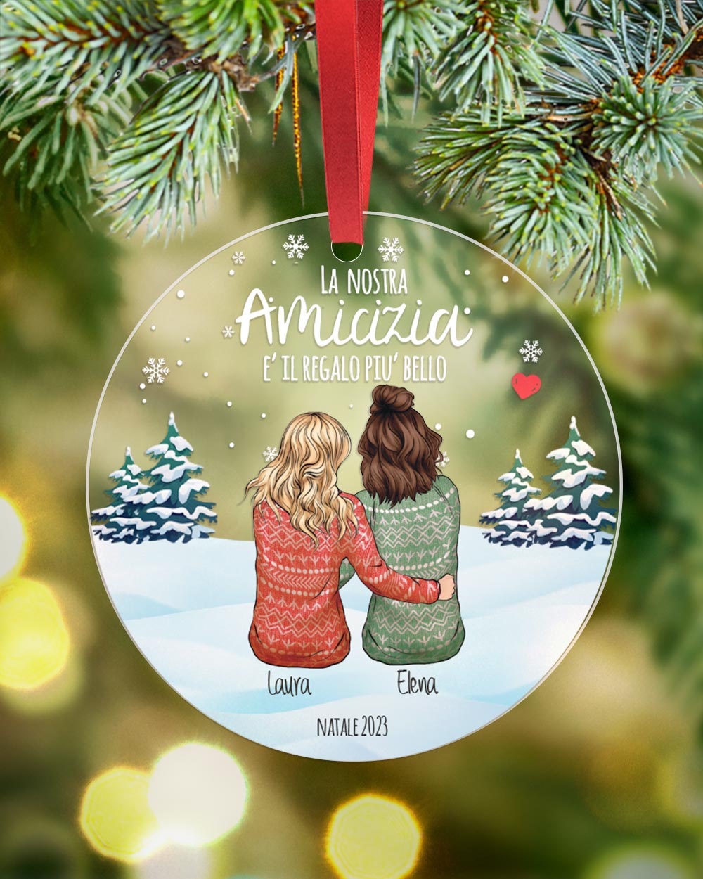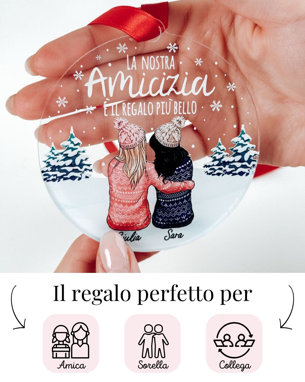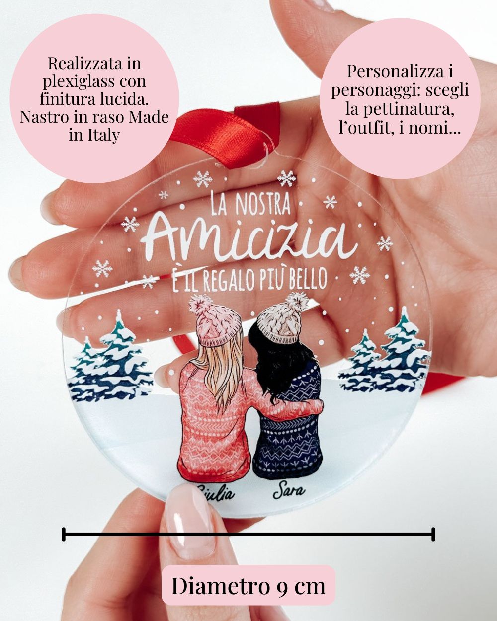 Il vero punto forte di questa decorazione di Natale è la possibilità di personalizzarla con un ritratto di voi due, viste di spalle, che simboleggia la vostra amicizia. Il ritratto è accompagnato da una dedica speciale, scelta da te, che rende la pallina ancora più personale. Ogni dettaglio è curato per rappresentare il legame unico che condividi con la tua amica, rendendo questo regalo un omaggio sentito e su misura. - Da appendere con nastro in raso Made in Italy