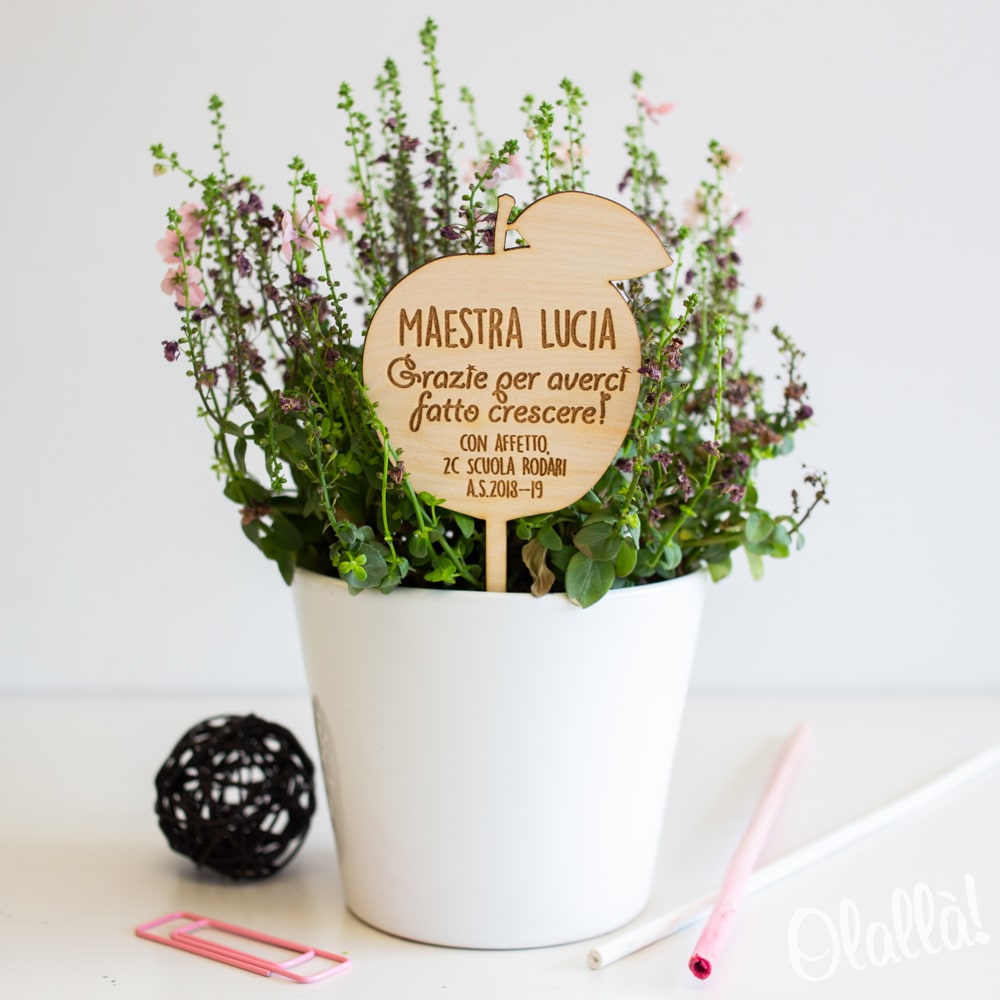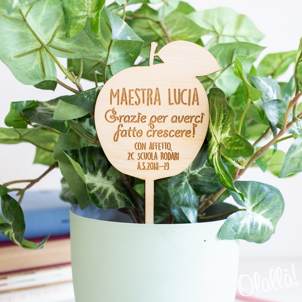 Decorazione per pianta in legno a forma di mela, personalizzata con una frase a scelta che verrà incisa a laser. Un regalo dolcissimo per la tua maestra del cuore.