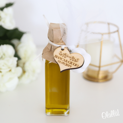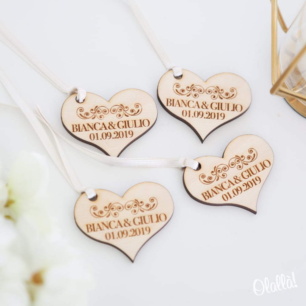 Tag in legno a forma di cuore con decoro vintage e incisione del nome degli sposi e della data del matrimonio. Ideale per confezionare splendide bomboniere gastronomiche e fare un regalo ai vostri ospiti economico ed originale! ATTENZIONE: Il prezzo varia a seconda della quantità acquistata: più pezzi acquisti meno costerà il singolo tag.
