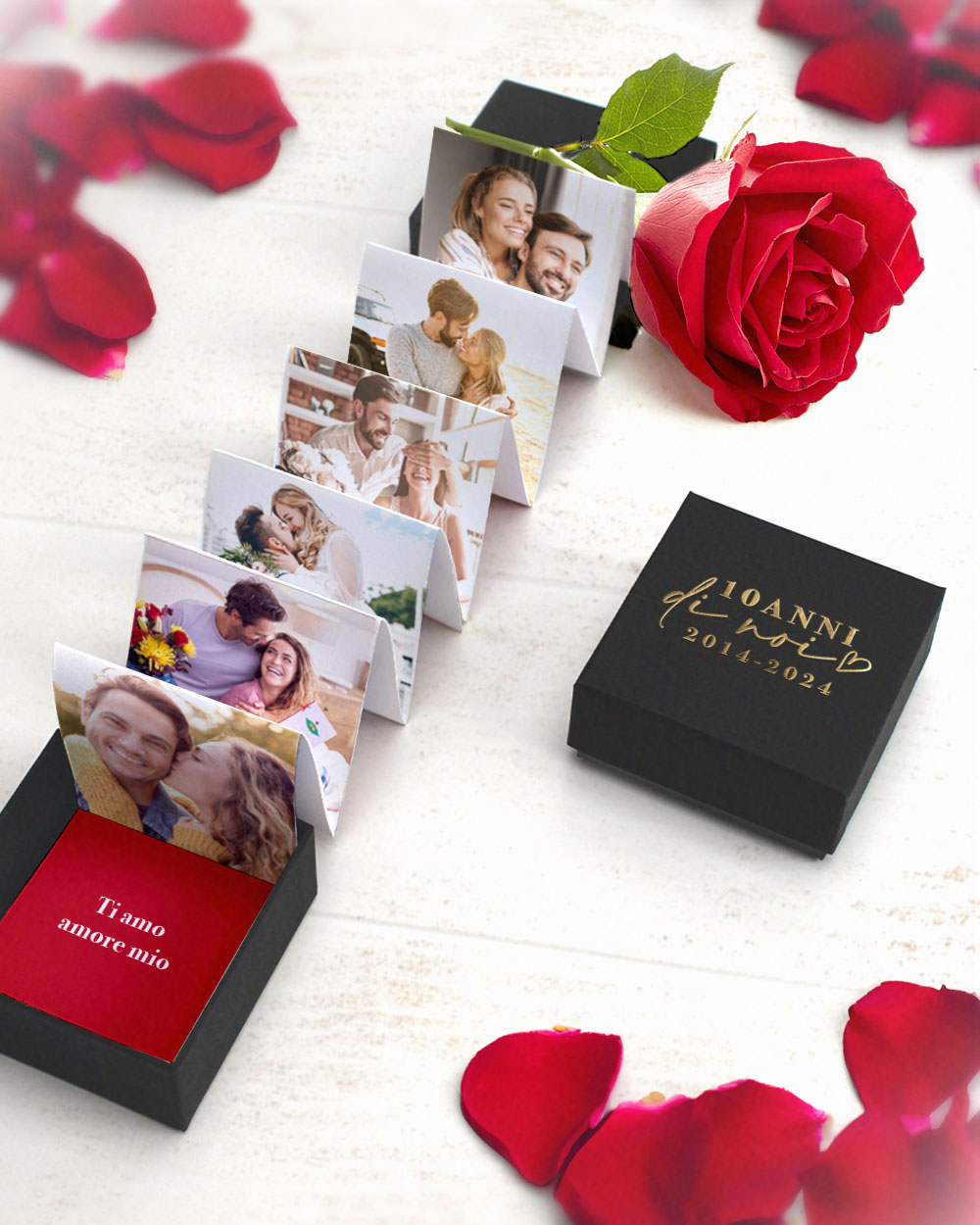 1. Un’idea originale per stupire: Stanco dei soliti regali? L’Explosion Box è l’alternativa creativa che farà battere il cuore del tuo partner. Questo capolavoro artigianale è stato progettato per suscitare emozioni autentiche. La sorpresa di aprire la scatolina e trovarsi immersi in una cascata di 20 foto che raccontano la vostra storia d’amore è un’esperienza unica e indimenticabile.