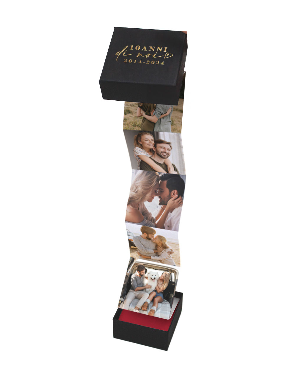2. Personalizzazione unica: Nessun altro regalo può catturare i momenti speciali come questa Explosion Box personalizzata. Scegli 20 delle tue foto preferite e noi le inseriremo con cura all’interno della scatolina. Puoi persino aggiungere una dedica personalizzata sul coperchio, realizzata con un elegante vinile. Sarà un regalo che racconta la vostra storia e dimostra quanto sia speciale il vostro legame.