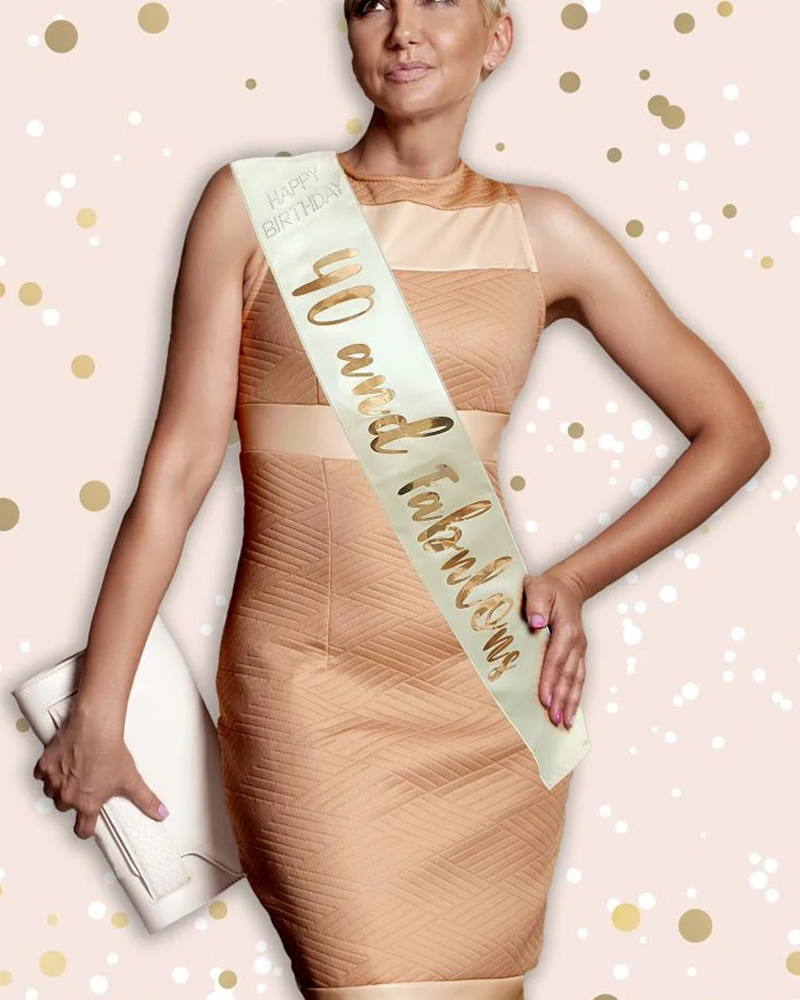 Fascia per il diciottesimo compleanno con la scritta “40 and fabulous” e nella parte superiore la frase “Happy birthday” in pietrine. Le scritte non sono personalizzabili.