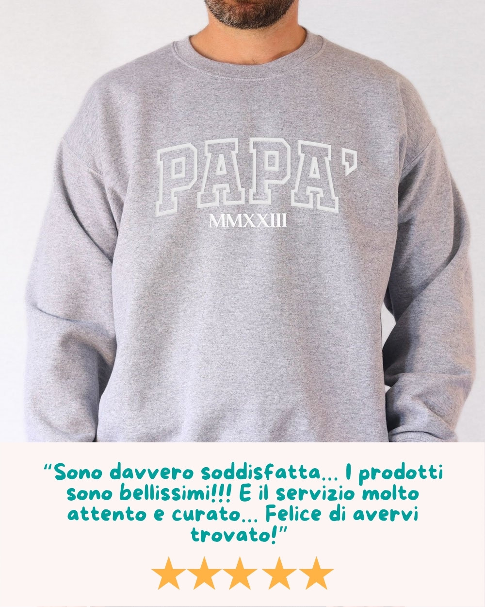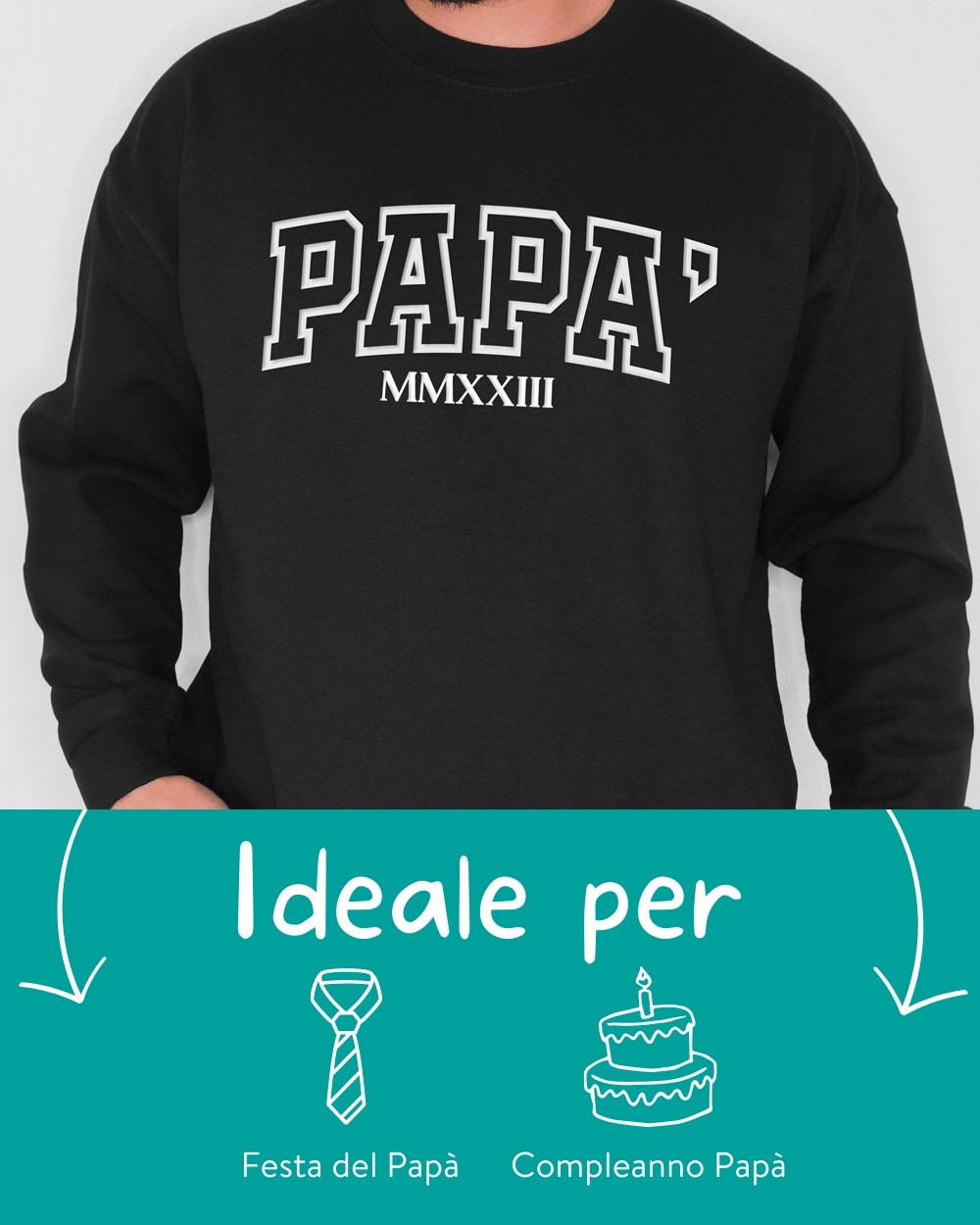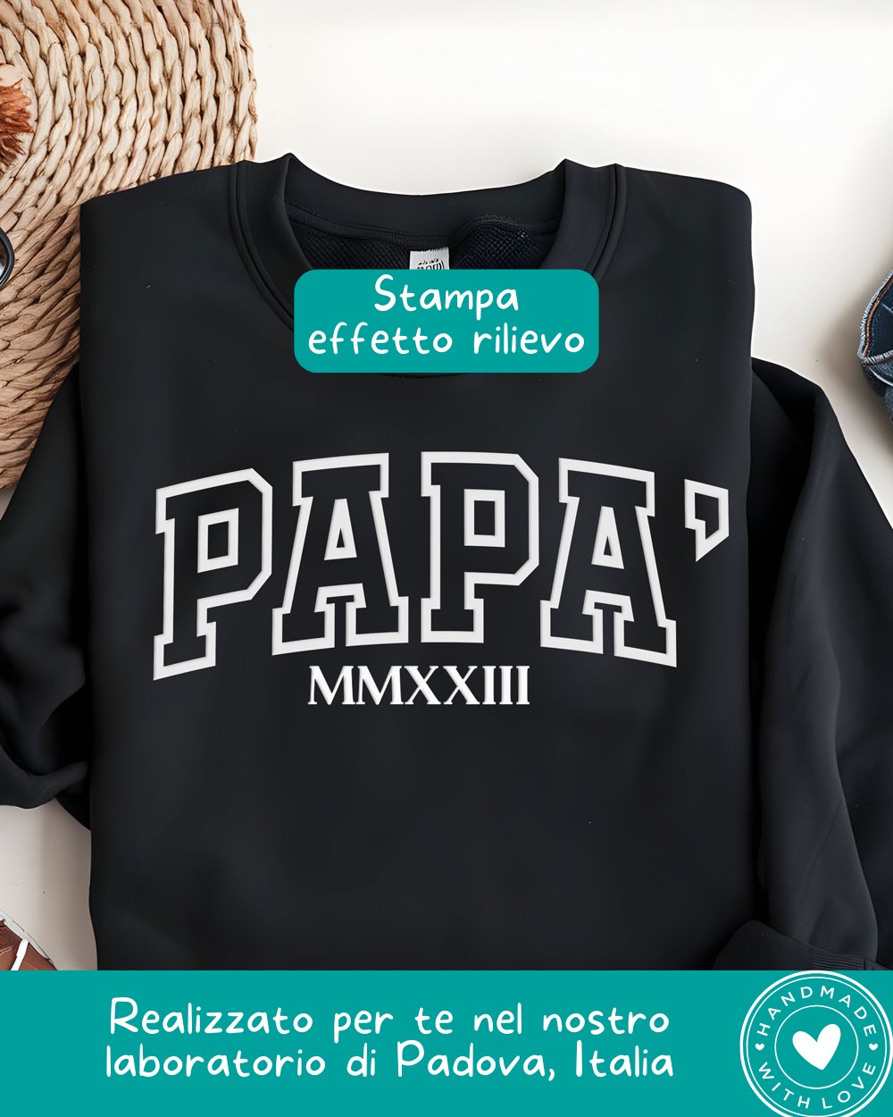 - Con personalizzazione effetto rilievo: La scritta “Papà” in rilievo in stile college dona un tocco di classe ed esclusività, rendendo questa felpa un capo distintivo.