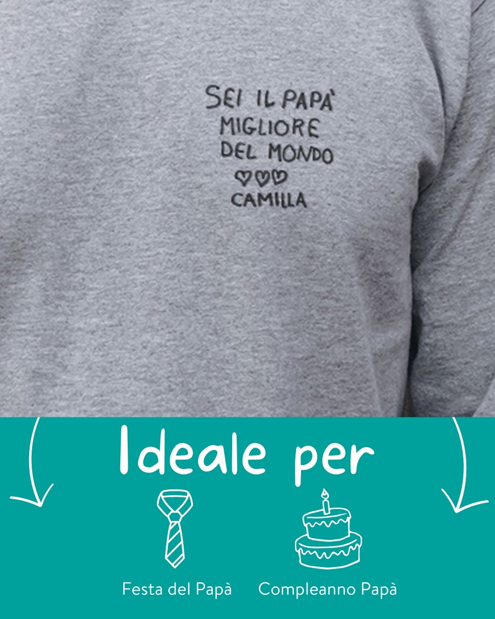 - Un capo completamente personalizzato e unico: Carica la foto della dedica più sentita, scritta a mano dal tuo bambino, e noi la trasformeremo in una stampa o un ricamo sulla felpa del papà. Ogni pezzo è unico, proprio perché parte dalla scrittura autentica del tuo piccolo, rendendolo un regalo speciale e irripetibile.