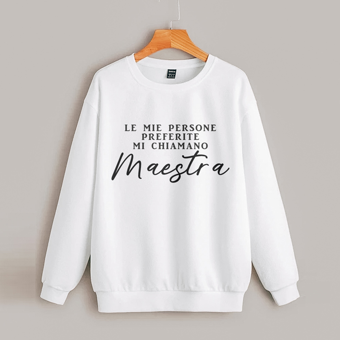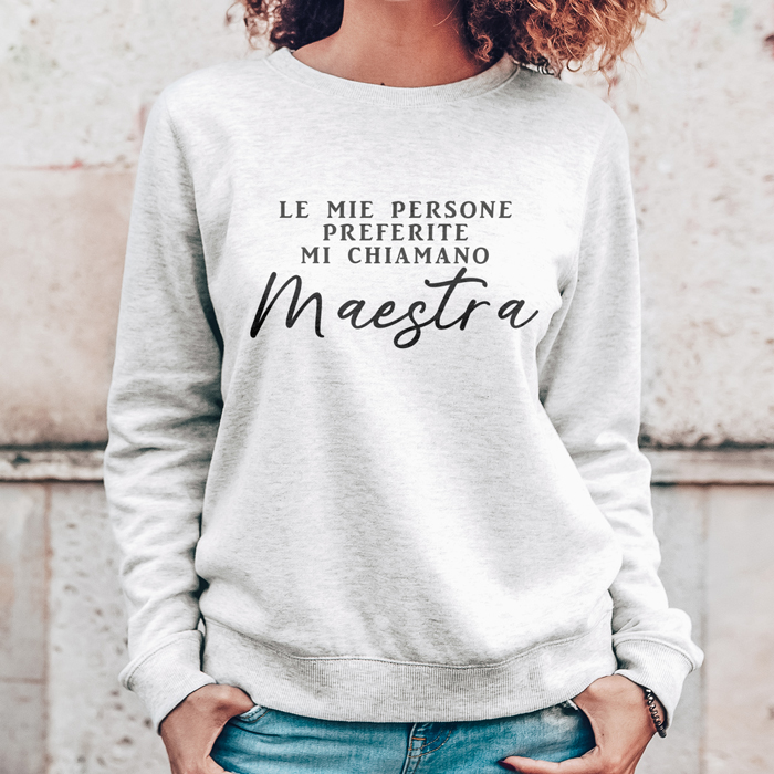 Questa bellissima Felpa Personalizzata per la Maestra, con la frase “Le mie persone preferite mi chiamano maestra”, sarà perfetta come regalo per ringraziare l’insegnante per tutto quello che fa per i tuoi bimbi. Una felpa per “maestre orgogliose” dalla spiccata vocazione educativa, è un pensiero simpatico e molto tenero che farà breccia nel cuore delle insegnanti.