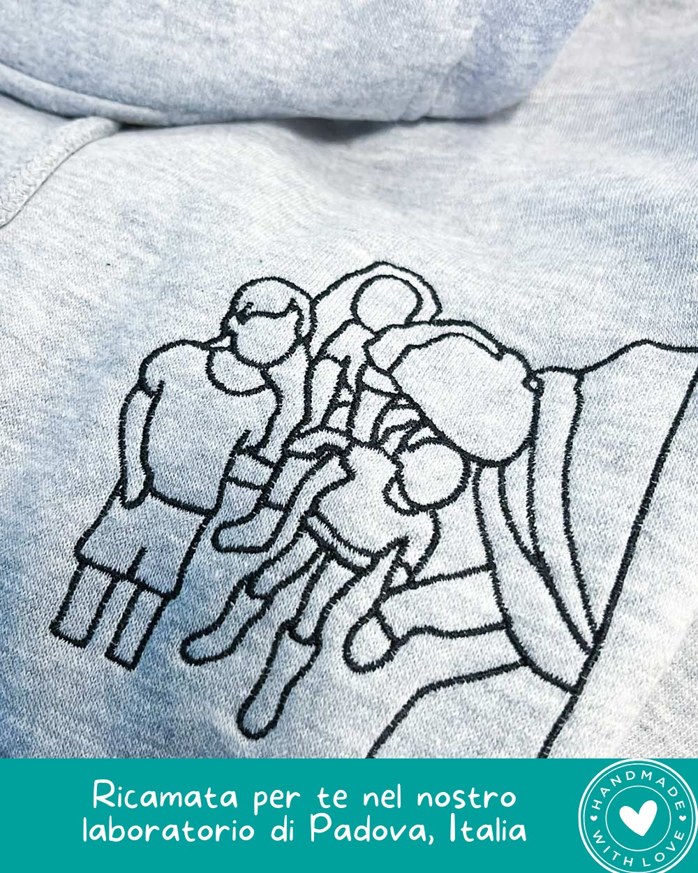 Ogni felpa viene personalizzata nel nostro laboratorio di Padova, Italia, con la massima attenzione ai dettagli e alla qualità.