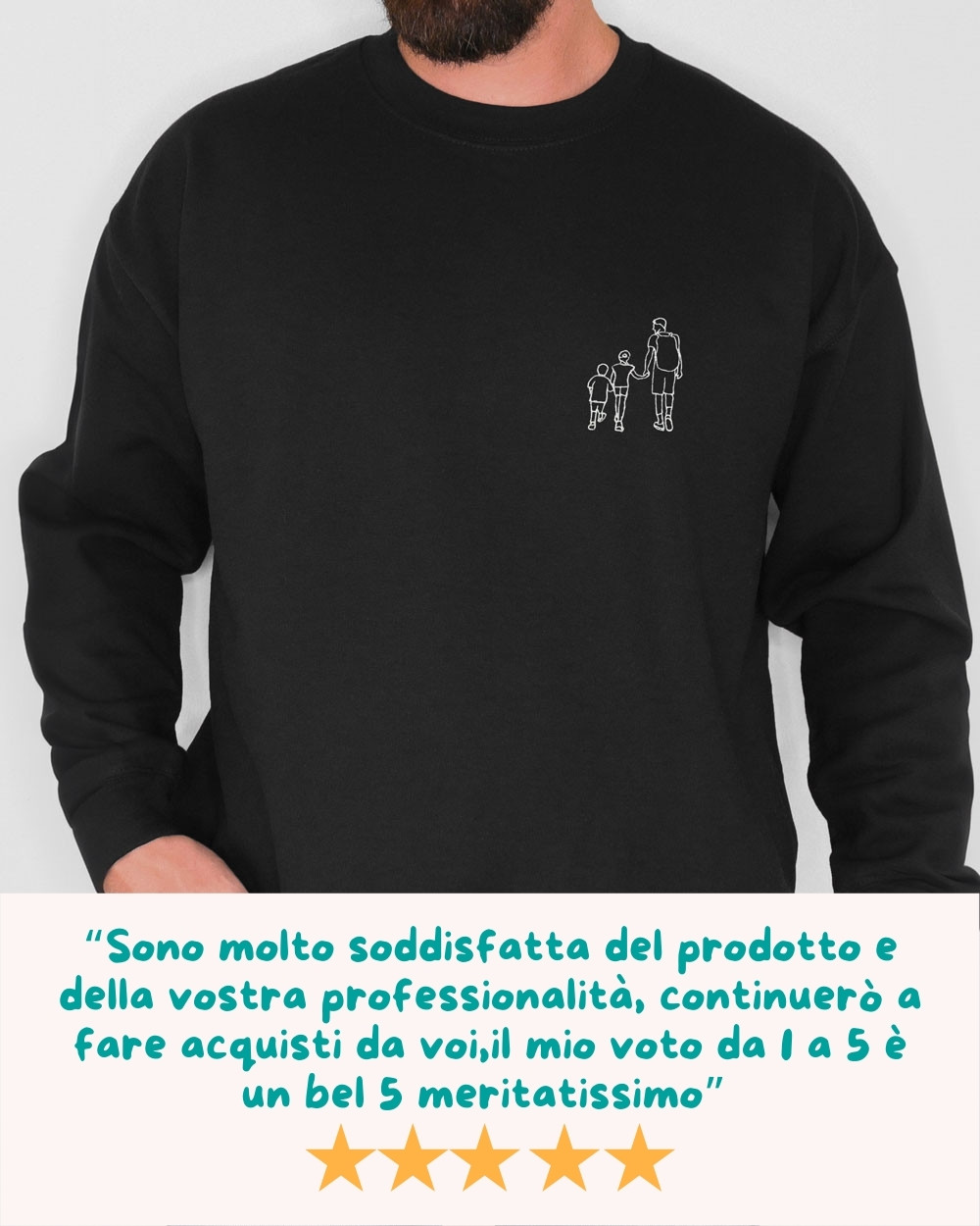 Un regalo unico, emozionante e dal design esclusivo. La felpa uomo personalizzata con ritratto line art è il modo perfetto per sorprendere il tuo papà con un capo d’abbigliamento che racconta il vostro legame in modo speciale. A partire da una tua foto, la nostra disegnatrice professionista realizzerà una grafica in stile line art, trasformando un semplice scatto in una vera opera d’arte, poi stampata direttamente sulla felpa.