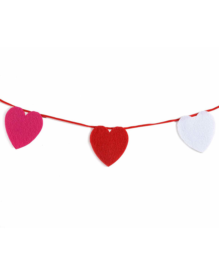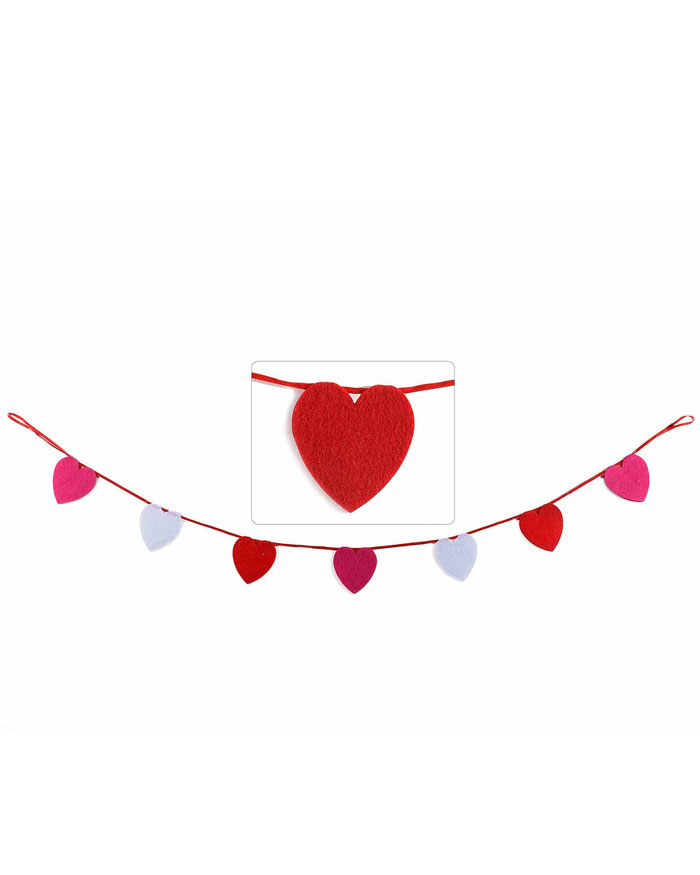 Allegro festone in panno, con una serie di cuoricini alternati di colore rosa, bianco e rosso. Il suo cordoncino rosso a contrasto lo rende perfetto per donare un tocco di colore diverso ai tuoi ambienti domestici! Esprimi alla tua dolce metà tutto il tuo amore con questo romanticissimo festone!