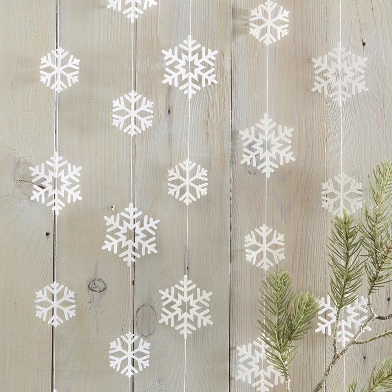 Festone con fiocchi di neve in carta, perfetto per essere appeso al caminetto o alle pareti. Che Natale sarebbe senza festoni e decorazioni natalizie? Con questo addobbo ricreerai la giusta atmosfera per accogliere con calore le festività natalizie.