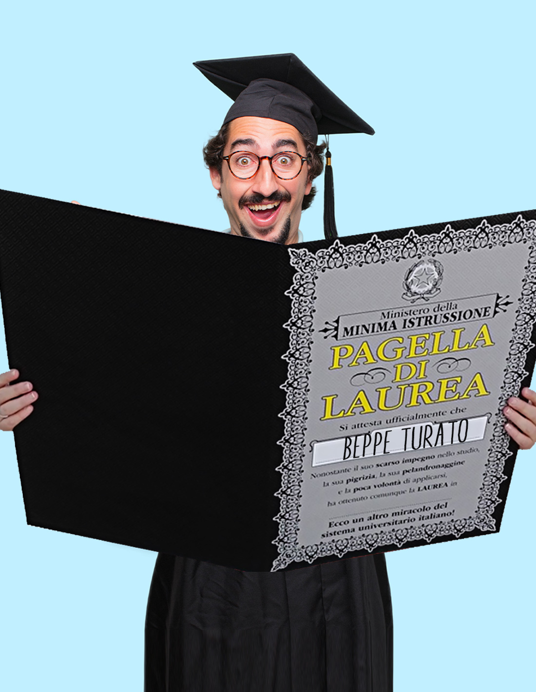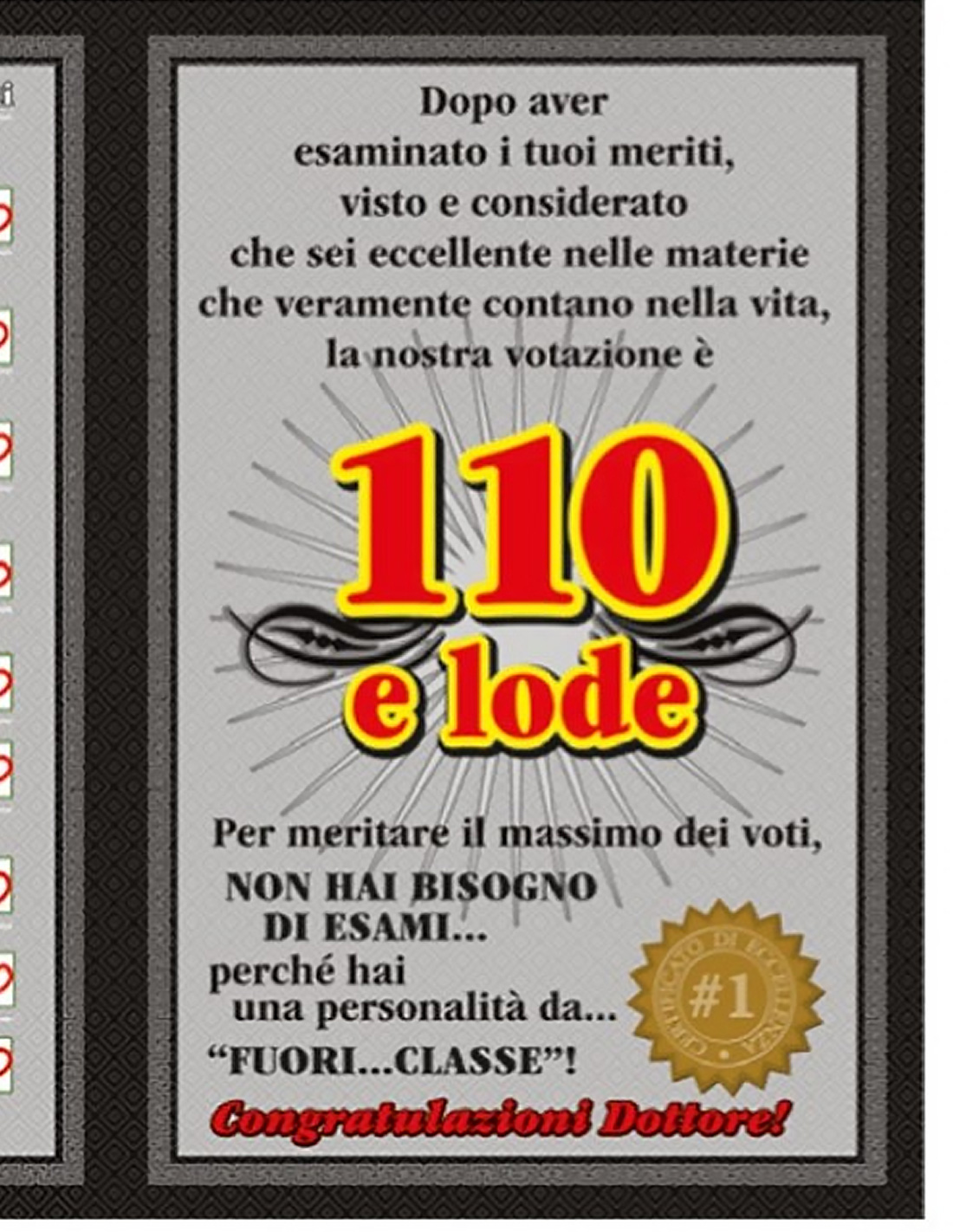 Farete veramente un gran figurone quando consegnerete questo biglietto gigante di cm. 80 X 60, completo di busta, che stupirà non solo per la misura ma anche per i divertenti testi dedicati alle varie materie d’esame, anche se non vere, e sul retro della pagella, un grande spazio per le firme di parenti ed amici che hanno partecipato alla discussione della tesi, che rimarranno a ricordo di questo momento emozionante. È possibile personalizzare il fronte della pagella inserendo il nome del laureato/a con un pennarello.