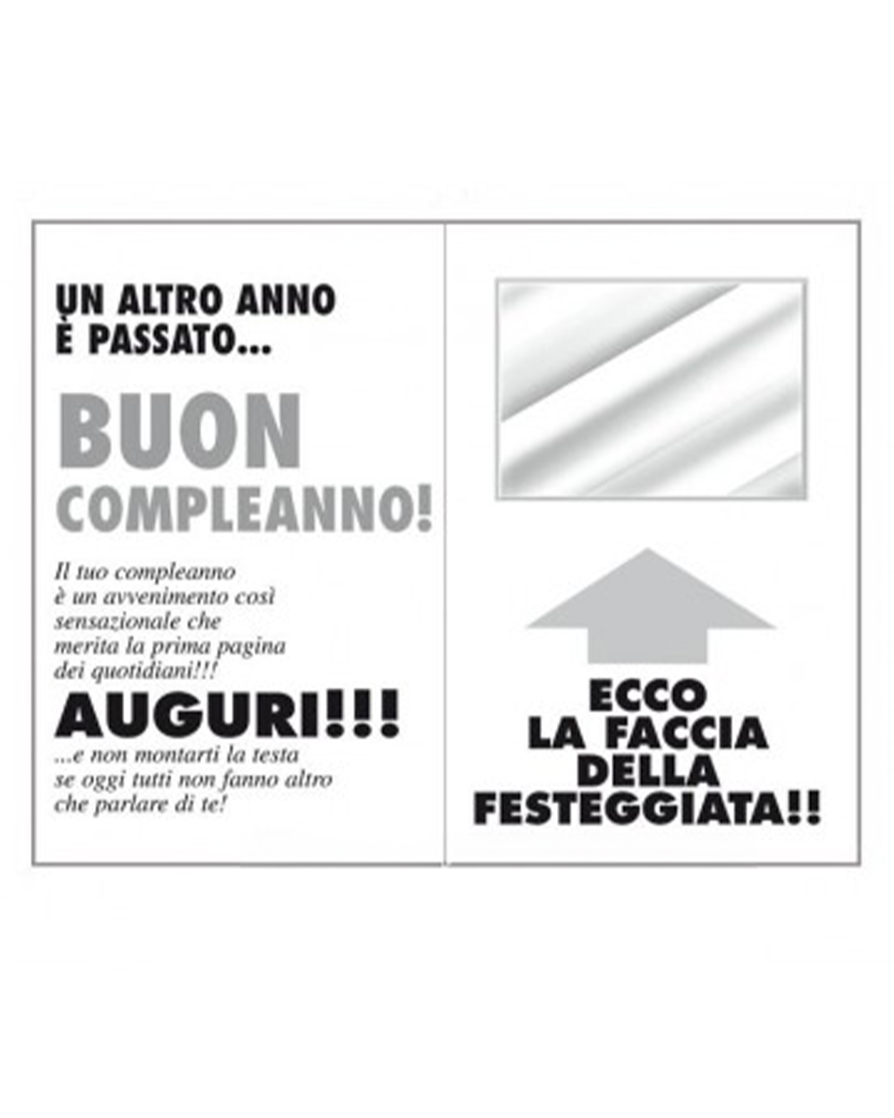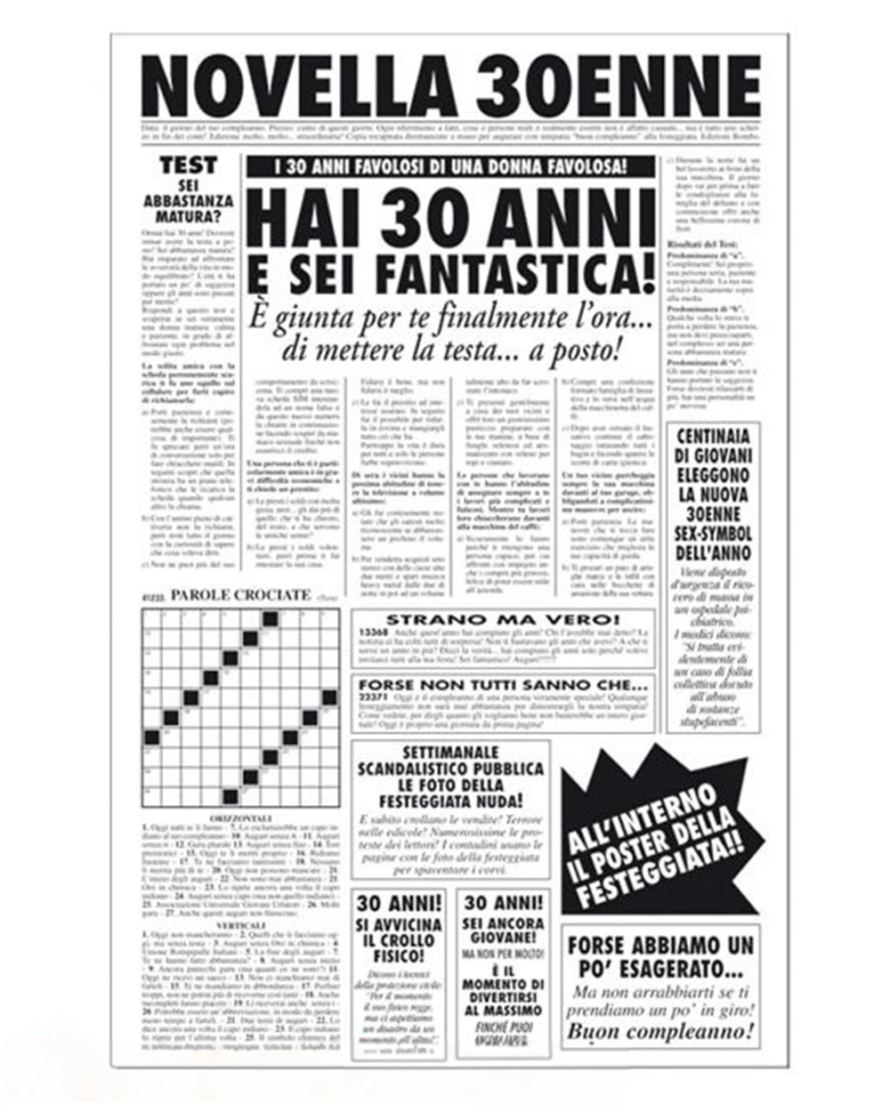 Realizzato con carta di alta qualità, in elegante bianco e nero, e con dimensioni generose di 32 × 49 cm, “Novella Trentenne” è più di un semplice biglietto d’auguri. Tra le sue pagine troverai articoli divertenti, cruciverba e giochi di parole pensati per intrattenere e stimolare sorrisi e risate. E per un tocco finale di sorpresa, all’interno del giornale si nasconde uno specchio, affinché la festeggiata possa ammirare la sua bellezza radiosa, accompagnata dall’affettuoso promemoria di rimanere sempre umile e autentica.
