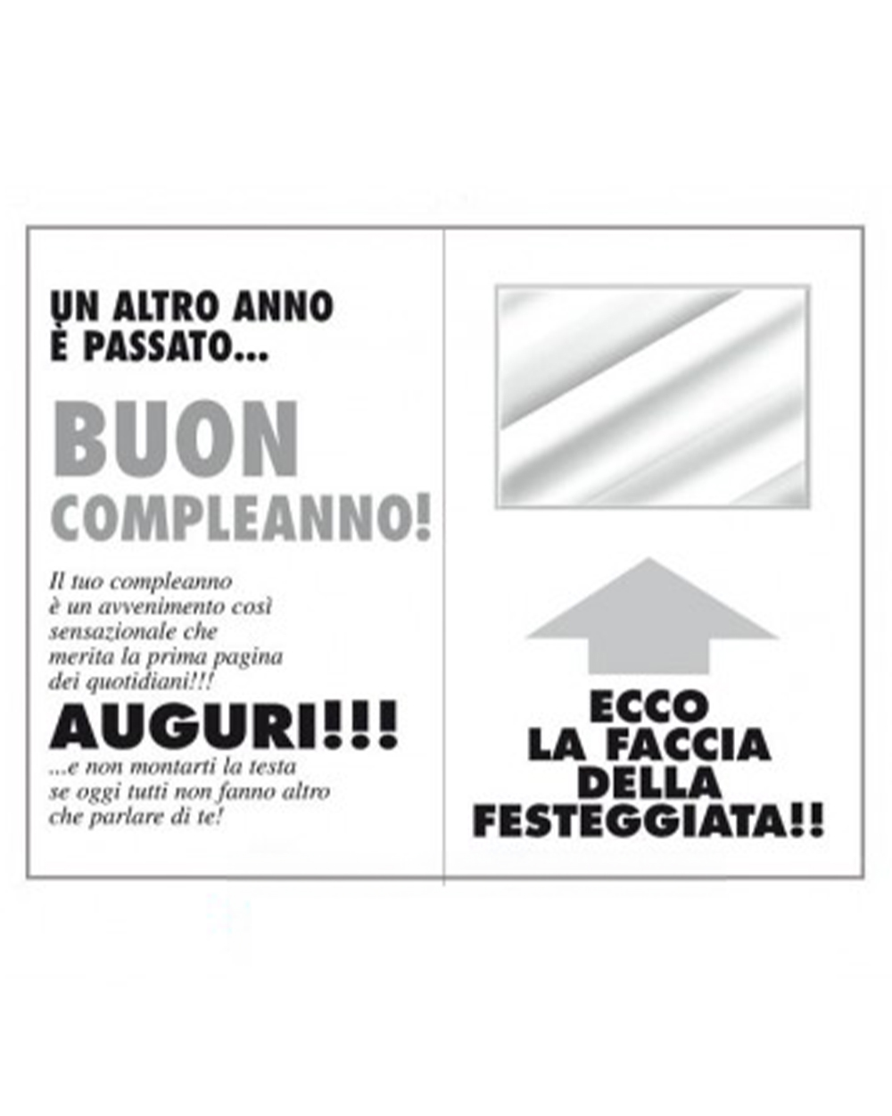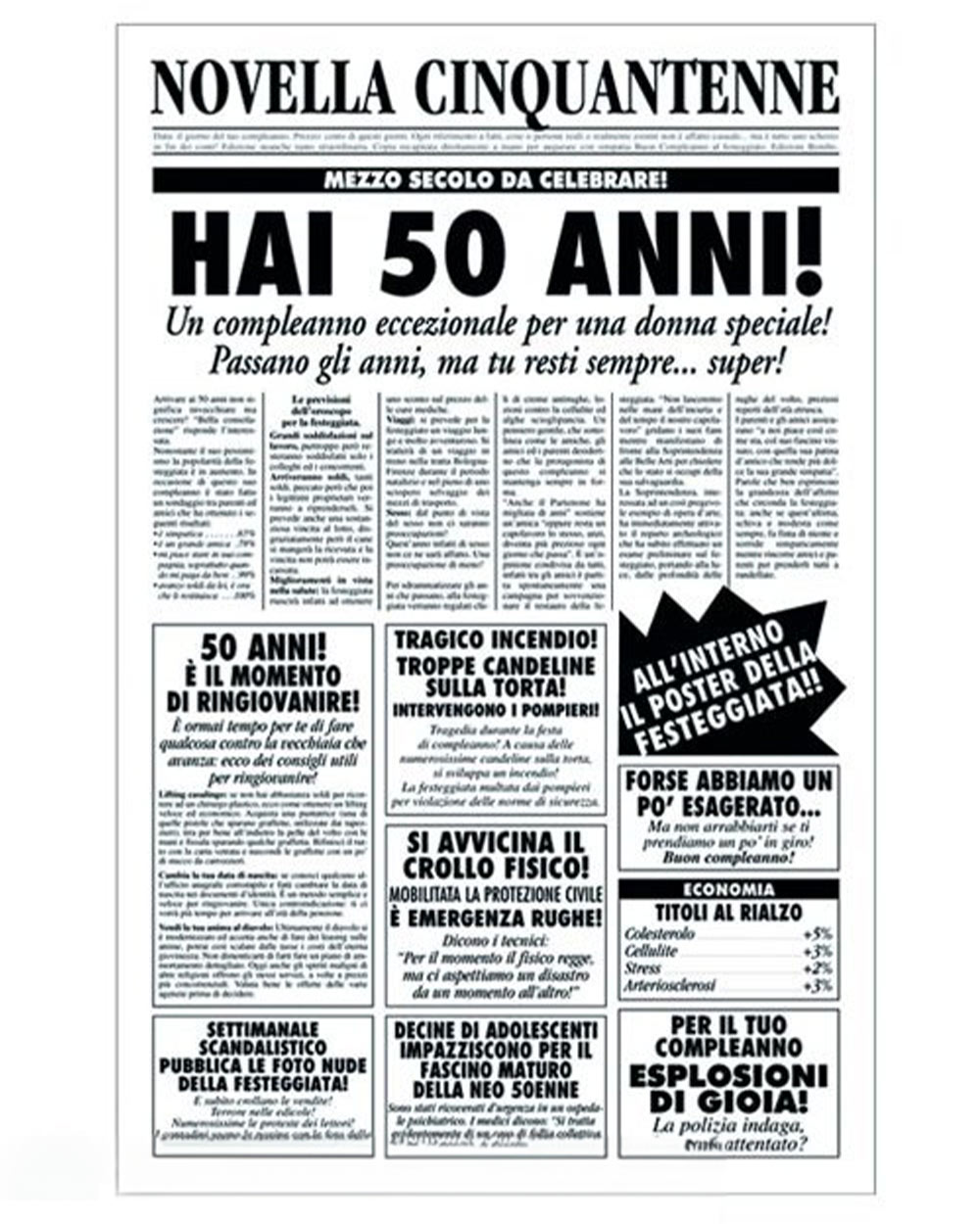 Se sei a conoscenza di un imminente e significativo compleanno, regala un sorriso speciale con il nostro unico e divertente biglietto di auguri, “Novella Cinquantenne”. Questo biglietto, stilisticamente simile a un giornale quotidiano, cattura l’attenzione con notizie ironiche e divertenti su gossip, cultura, sport e bellezza, tutte dedicate alla splendida neo 50enne.