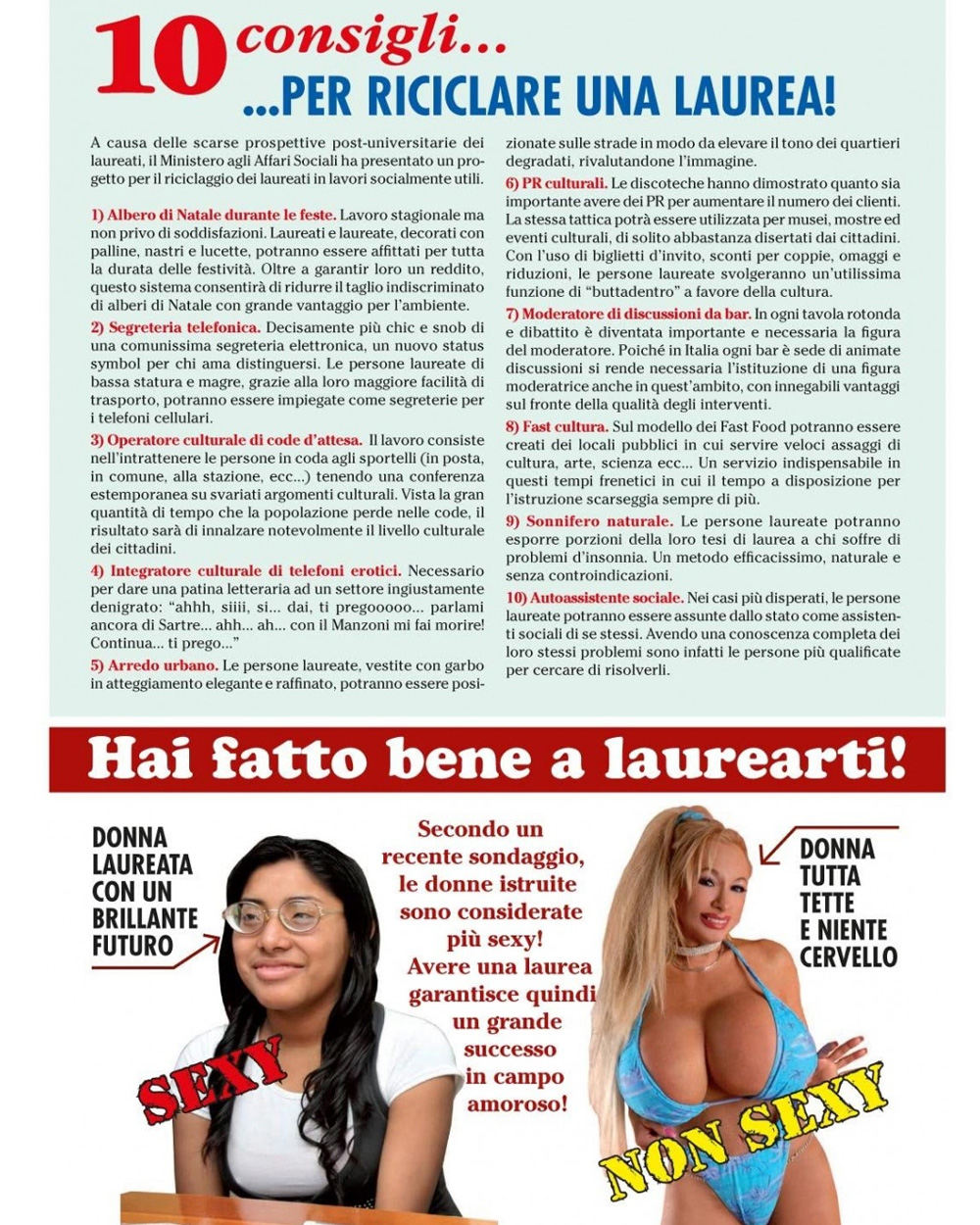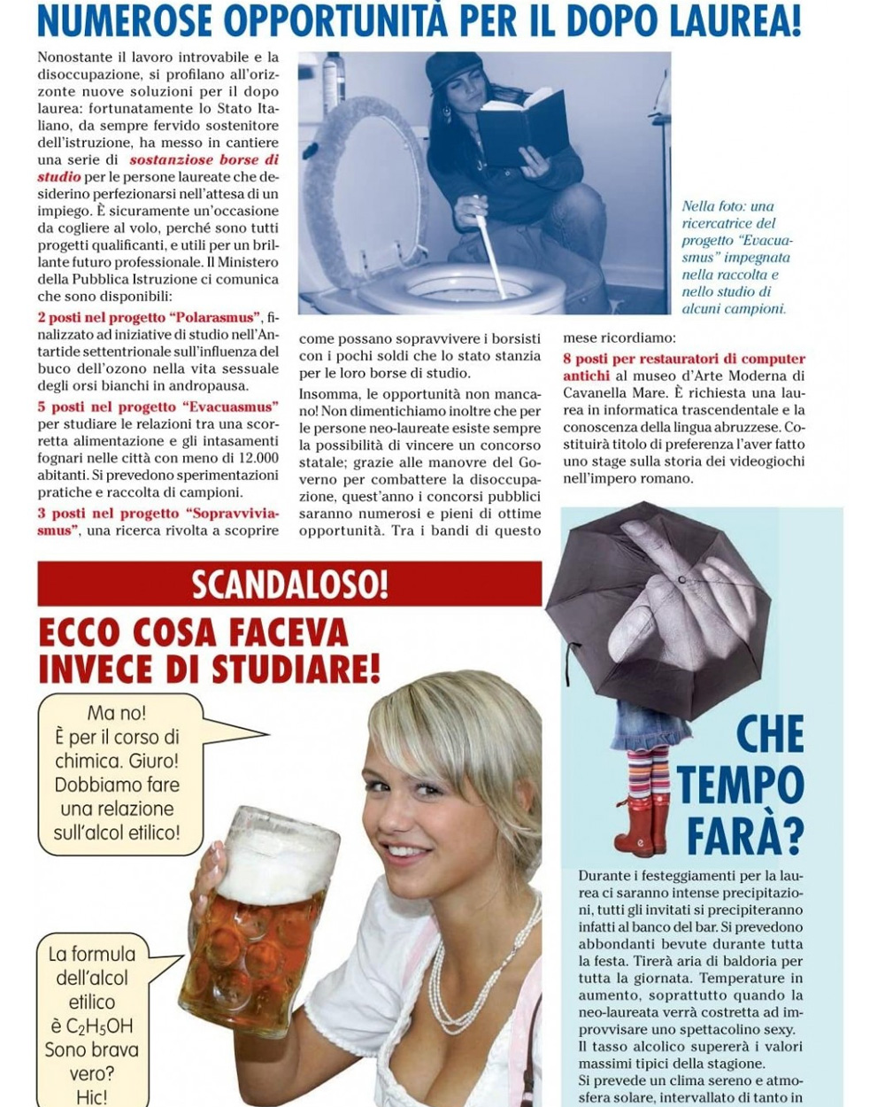 Rivista di 21×30 centimetri e 8 pagine, che puoi usare come biglietto alternativo, è pratica e colorata come i più famosi tabloid italiani e internazionali. Al suo interno, la neo-laureata troverà notizie, servizi, opinioni di lettori, giochi e test di vario genere, tutto giustamente incentrato su di lei e sul traguardo appena raggiunto. Per un giorno la farai sentire davvero l’idolo delle folle e dei giornali!