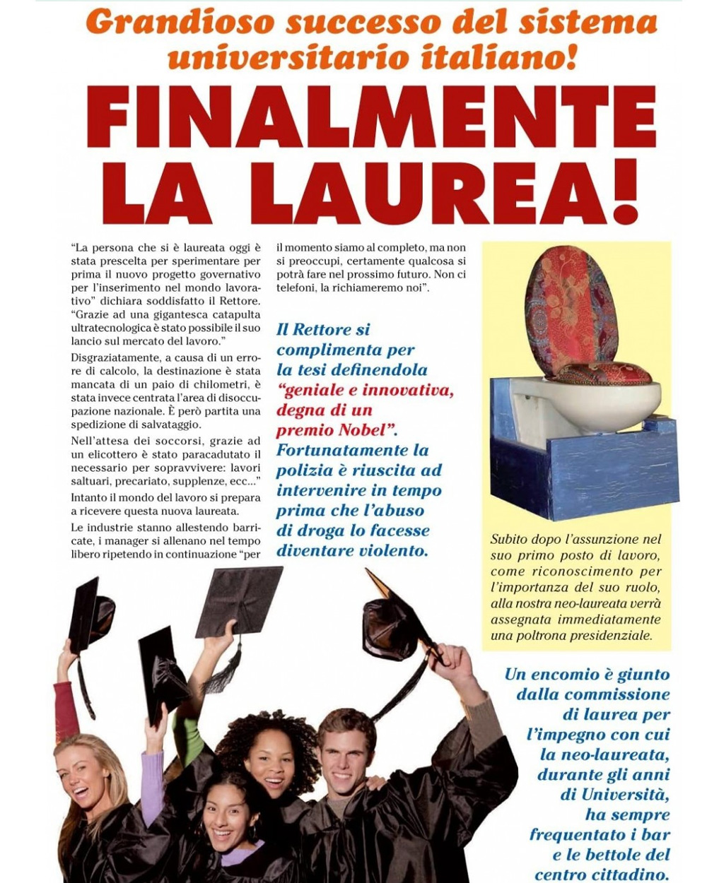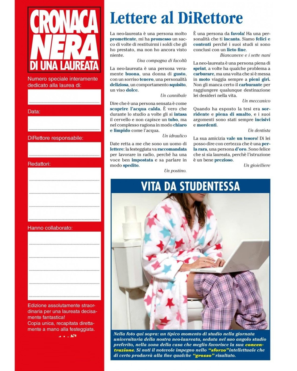 Simpaticissima finta rivista ispirata ad un giornale vero con tante notizie scherzose, curiose e ironiche sulla laureata e il tanto atteso e agognato giorno della laurea. Un modo originale per celebrare questo importante traguardo in maniera spiritosa e goliardica, così da strappare una fragorosa risata alla fortunata neo-dottoressa che sarà per un giorno regina del gossip!