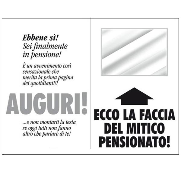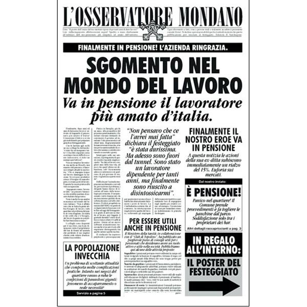 Finto giornale con edizione speciale che annuncia il pensionamento del vostro collega. Il quotidiano è interamente dedicato a lui, con tante frasi ed articoli esilaranti che parlano della sua “travagliata” carriera da vero eroe del lavoro (si fa per dire!). Fai scoppiare di risate il neo pensionato e tutti gli invitati alla festa con questo simpatico giornale tutto da leggere ad alta voce!