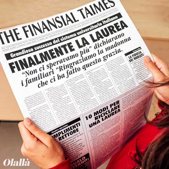 Questo finto giornale è perfetto per festeggiare in modo scherzoso il vostro amico o amica, oppure nipote, che ha appena raggiunto il traguardo tanto atteso. Si sostituisce simpaticamente al biglietto di auguri e contribuirà a creare il giusto clima di goliardia, tipico dei festeggiamenti di laurea. All’interno contiene un foglio di carta effetto specchio con la scritta “Ecco la faccia di una persona dal futuro brillante”: il festeggiato potrà quindi specchiarsi all’interno. La struttura è quella di un tradizionale quotidiano dove la notizia principale è proprio quella della novella laurea, raccontata in modo divertente e spiritoso.