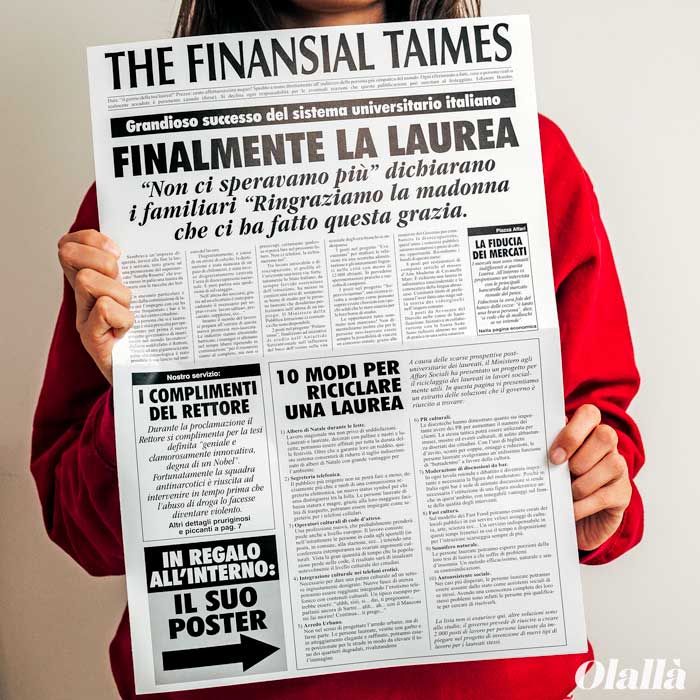 Spiritoso Finto Giornale “The finansial taimes” come Biglietto per auguri di Laurea. Festeggia il neolaureato con un’idea divertente, perché un giorno è davvero memorabile solo se finisce su un giornale!