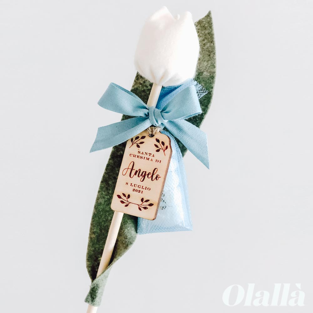 Il fiore di tulipano è disponibile in vari colori a scelta. Il nastrino di cotone anche esso ha varie colorazioni tra cui scegliere, come pure il tulle. La tag in legno spesso 3 mm viene personalizzata con incisione al laser sulla base delle vostre indicazioni. Dopo l’acquisto vi verrà inviata una bozza via email in modo che voi possiate controllare la perfezione della vostra bomboniera prima che vada in stampa.