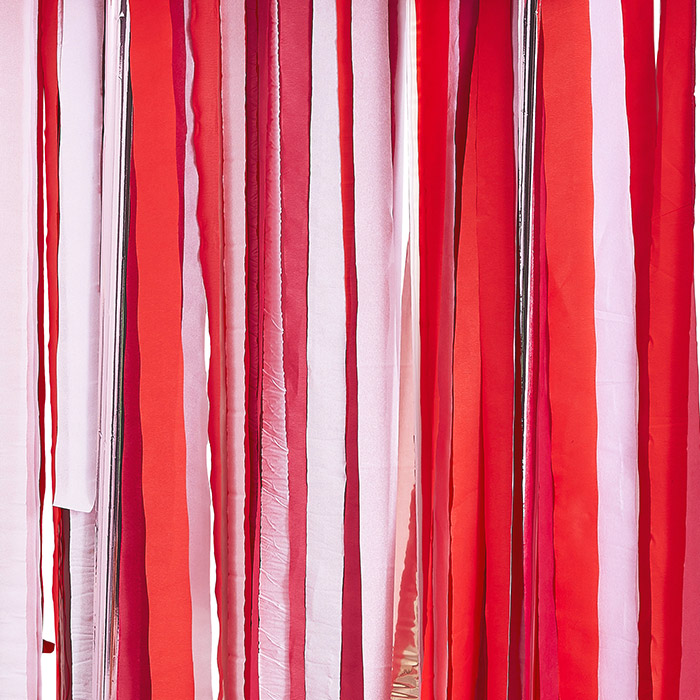 Ogni confezione contiene un fondale con 170 m di fettucce rose gold, rosso e rosa e un nastro trasparente di 1, 5 m per appendere il fondale.