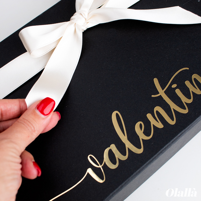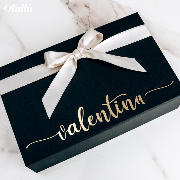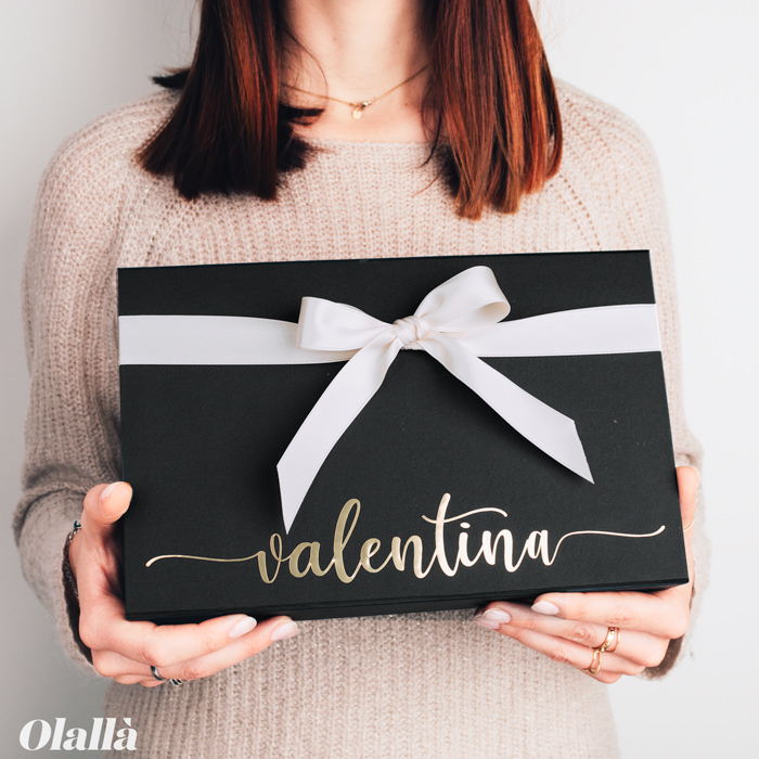 Elegante scatola regalo gift box nera con chiusura magnetica personalizzata con nome in stile calligrafico color oro, argento o bianco a scelta. Dimensioni 27 cm x 17 cm per 7 cm di altezza. Realizzata in cartoncino rigido e adornata da un fiocco in nastro di raso di colore a scelta. La scatola, adatta per regali prestigiosi, può essere personalizzata anche con una frase sul retro del coperchio, in modo da realizzare una sorpresa ancora più grande per il destinatario. Ad esempio, “Sei la persona più speciale per me”, oppure “Diventerai Nonna”, “Vuoi essere la mia testimone?”. Una volta regalata, questa scatola può diventare un perfetto porta gioie in bagno o in camera, un contenitore di cose utile e sfizioso. Una scatola regalo, insomma, che è essa stessa un vero e proprio regalo!