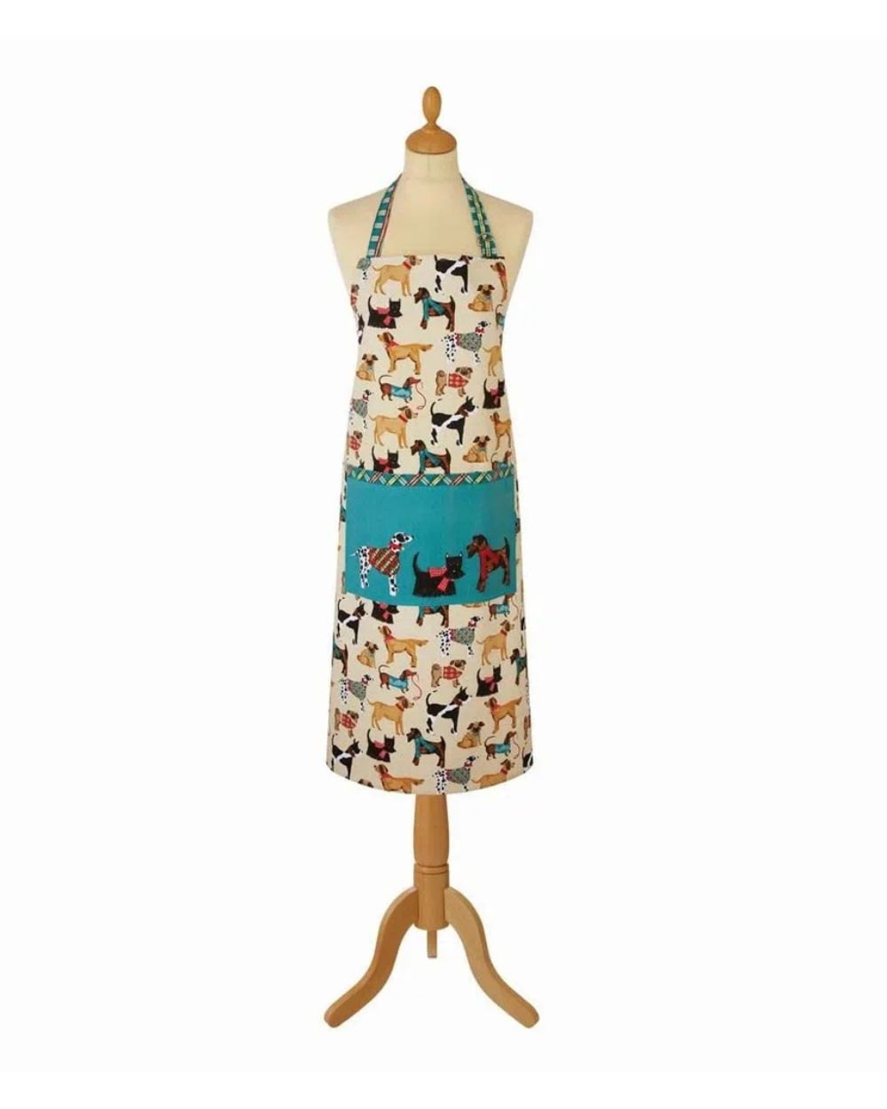 Porta allegria nella tua cucina con questo grembiule decorato con una vivace fantasia di cani. Realizzato in tessuto resistente e lavabile, è perfetto per proteggerti durante le tue sessioni di cucina. Il design include una comoda tasca centrale di colore turchese con dettagli decorativi, ideale per tenere a portata di mano utensili o accessori.